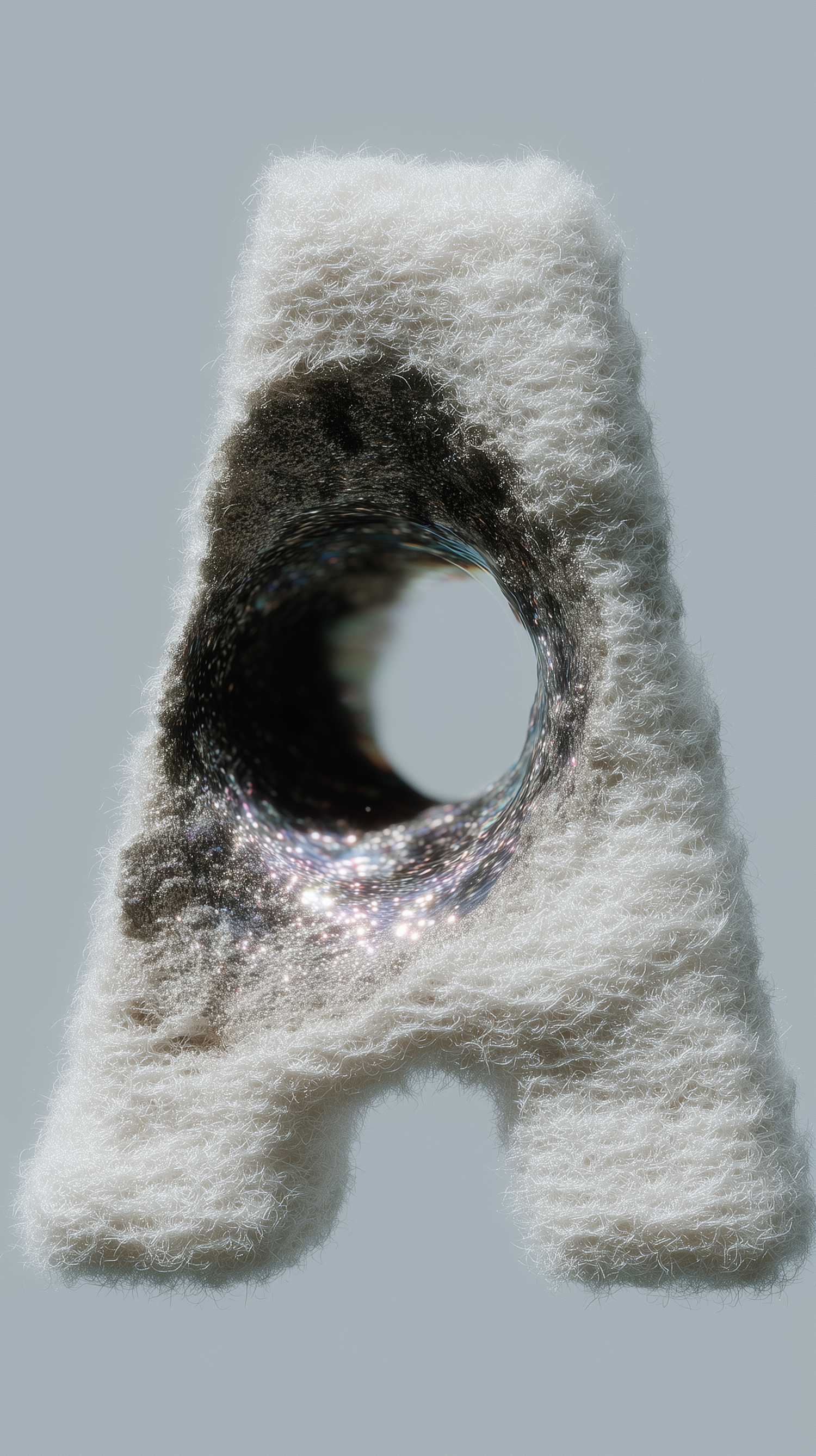 A textured 3D letter 'A' with a fluffy surface and a reflective void in the center, set against a neutral background.