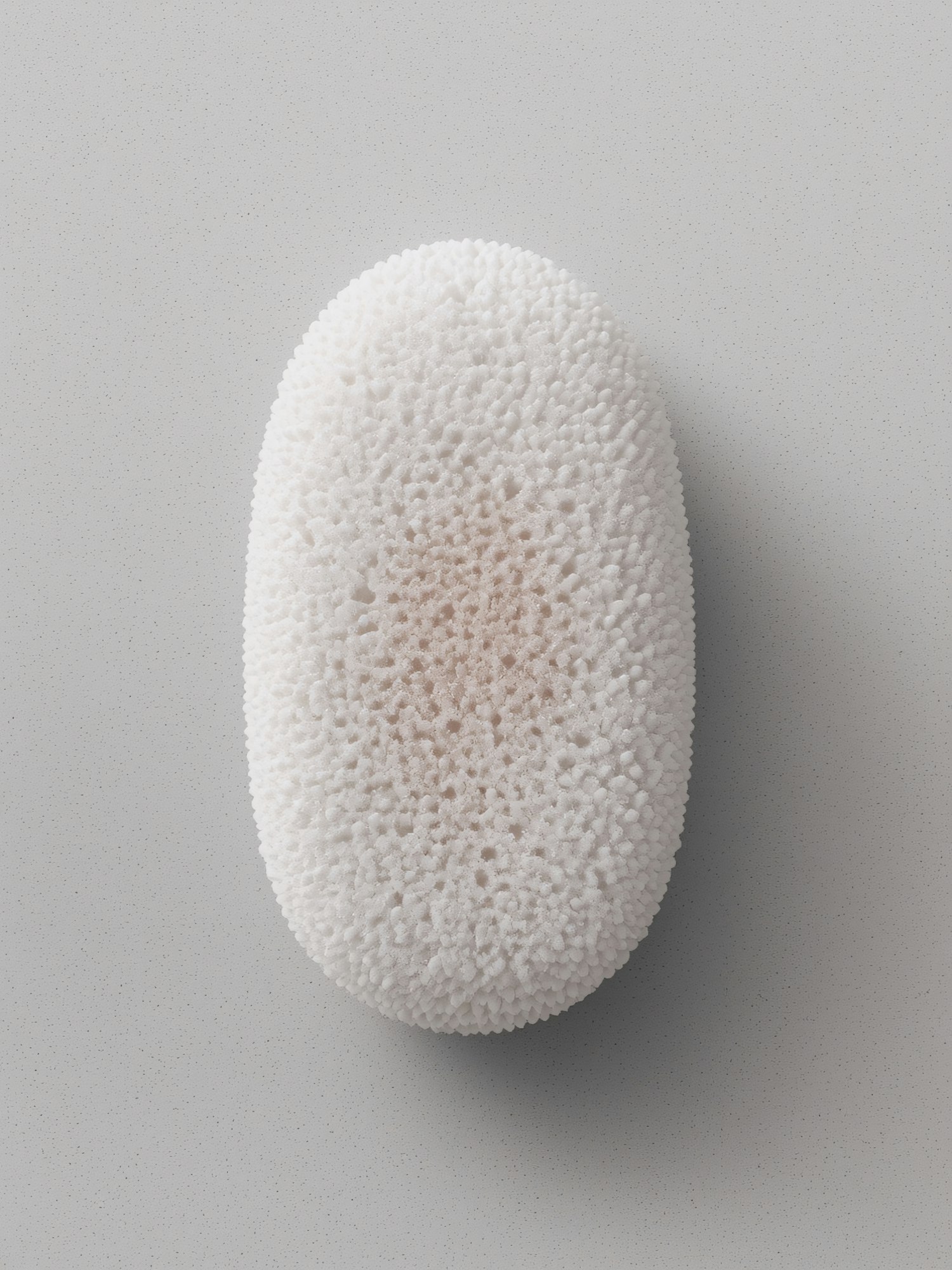 A textured white object, resembling a pumice stone, on a smooth gray surface, showcasing its intricate porous details.