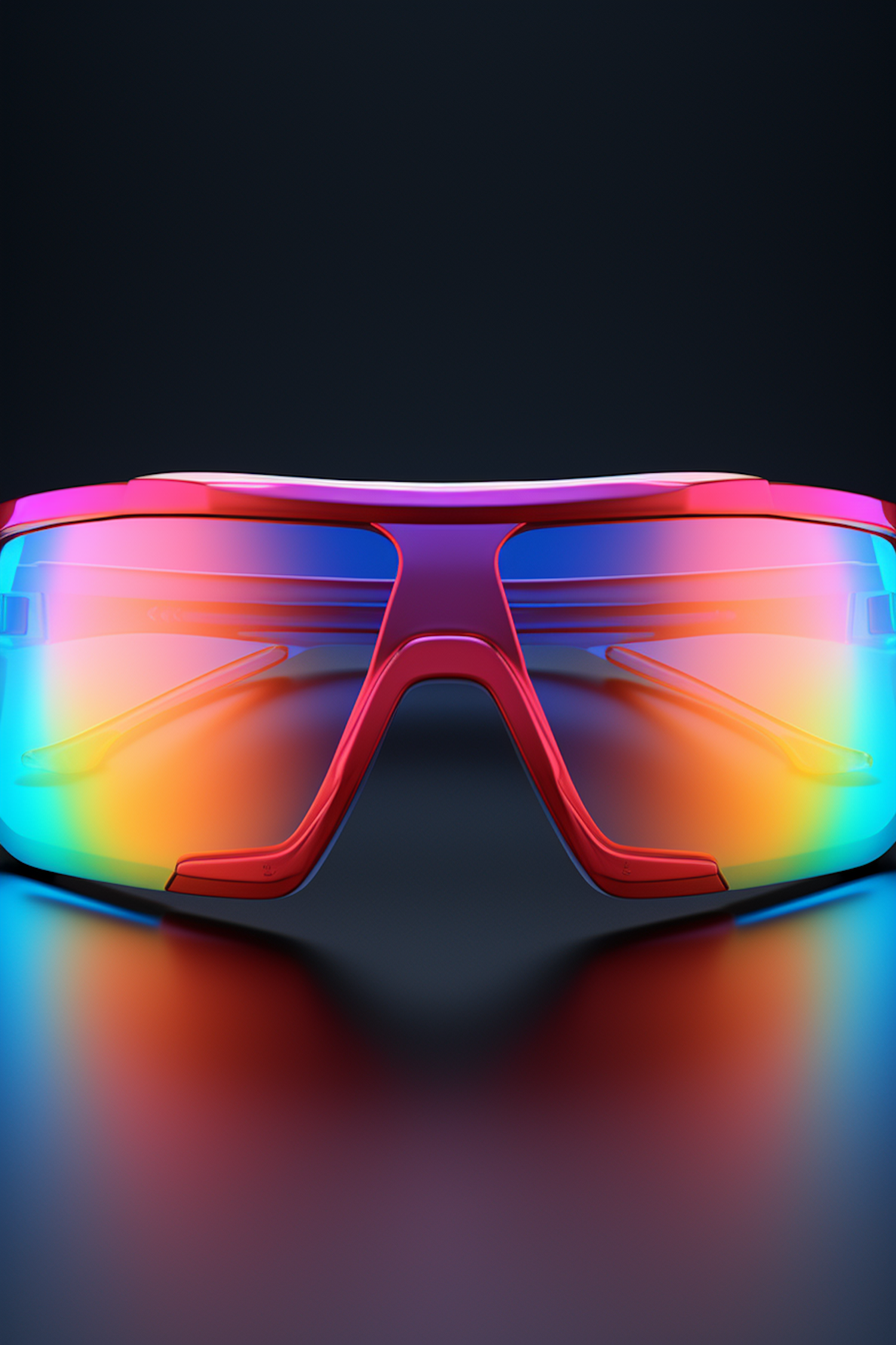 Futuristic red sunglasses with multicolored reflective lenses on a dark background, showcasing a sleek and modern design.