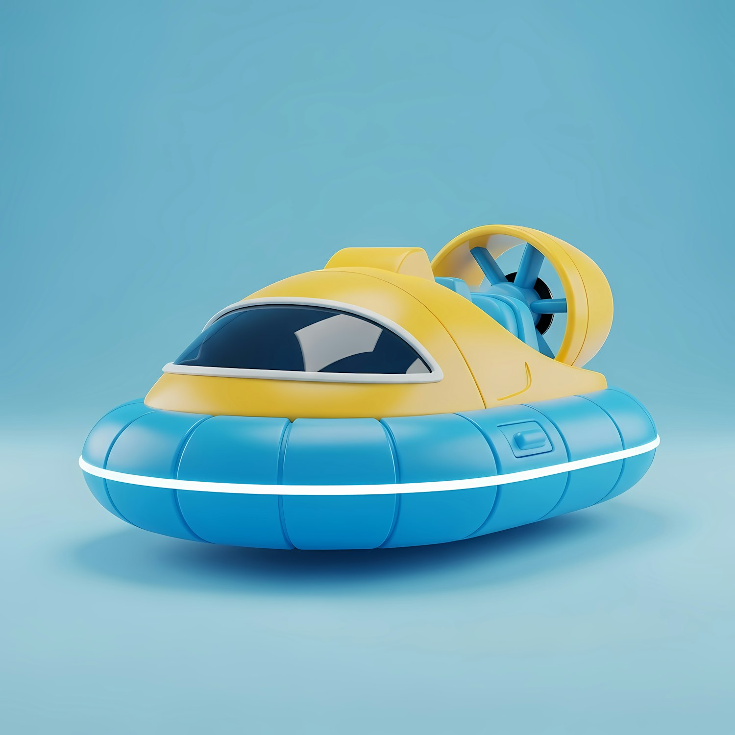 Bright and playful 3D-rendered hovercraft toy in yellow and blue, featuring a sleek design and a rear propeller, set against a blue backdrop.