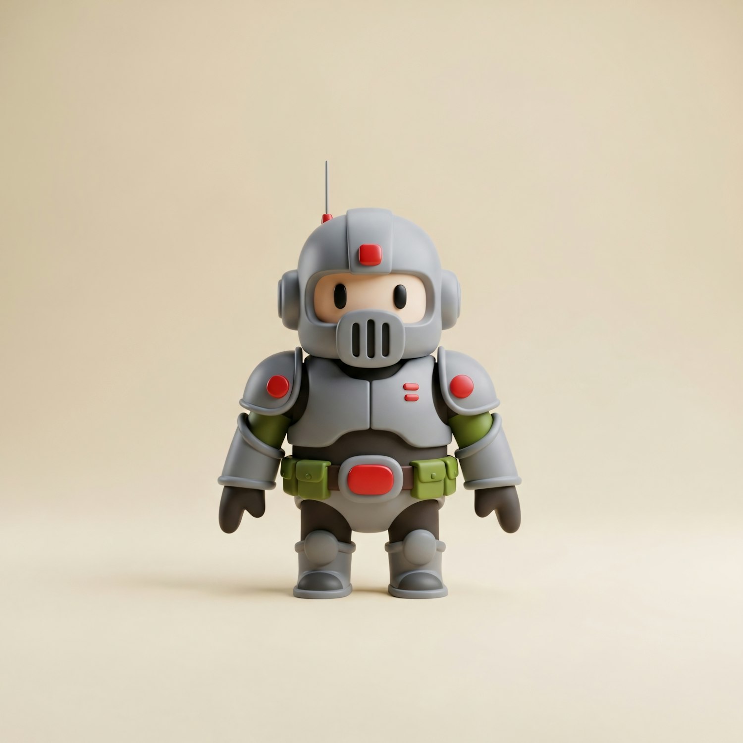 A cute 3D-rendered toy soldier in gray armor with red and green accents, standing against a beige background. Perfect for creative projects.