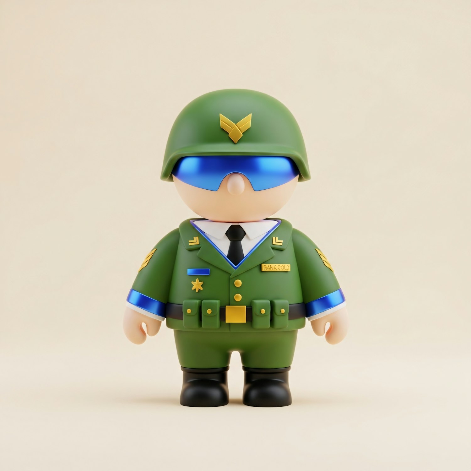 A cute toy soldier figure in a green uniform with gold and blue details, featuring a helmet and reflective goggles, on a beige background.