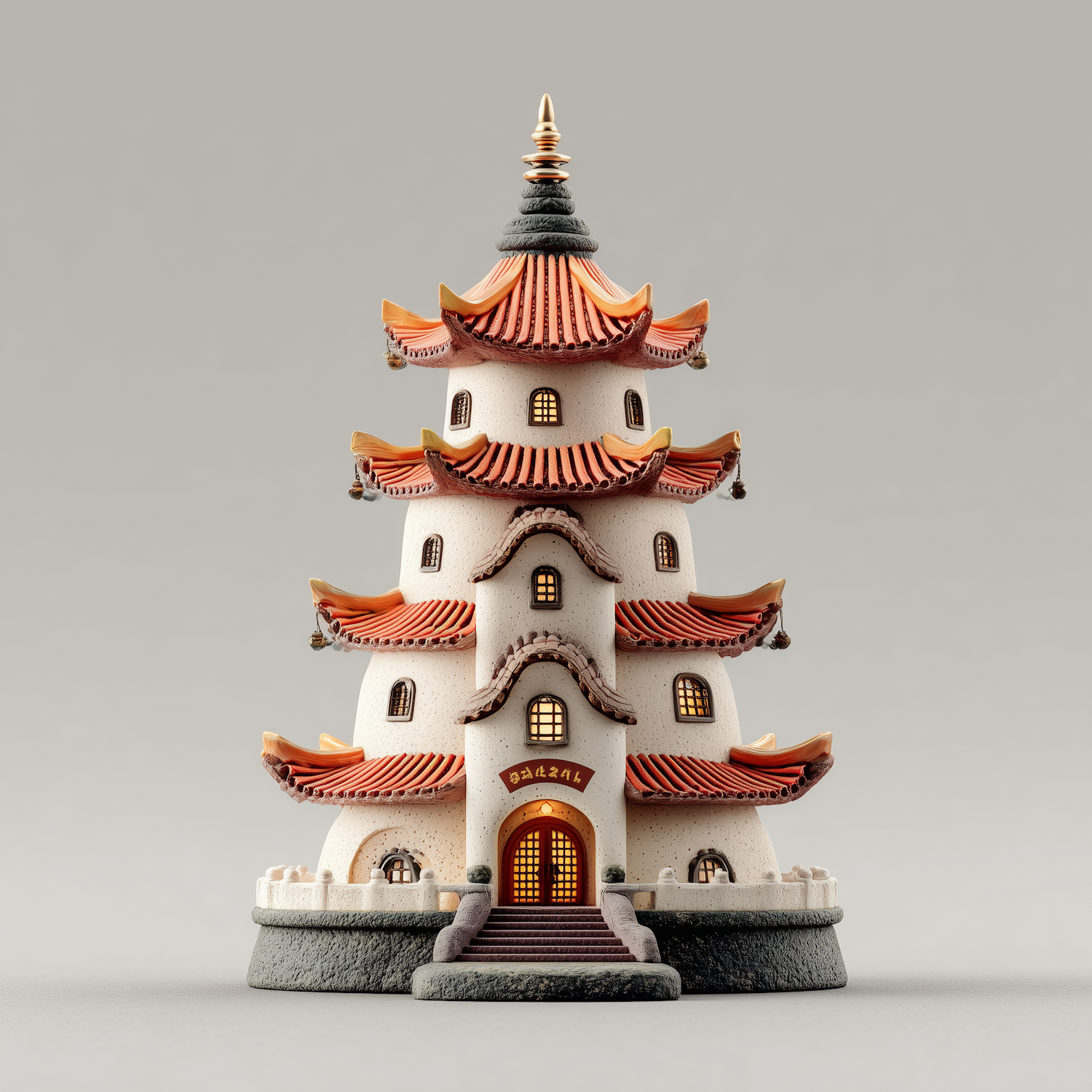 A beautifully detailed 3D model of a traditional pagoda with red tiled roofs and glowing windows, showcasing intricate architectural design.