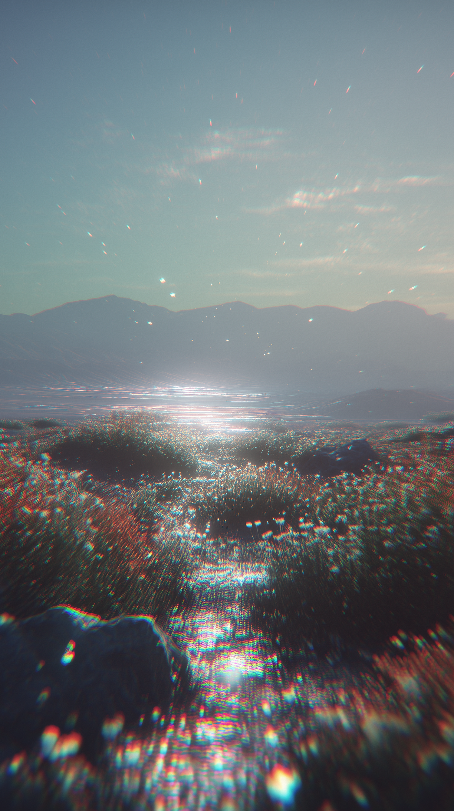 A tranquil landscape with shimmering water, lush vegetation, and distant mountains under a soft, clear sky.