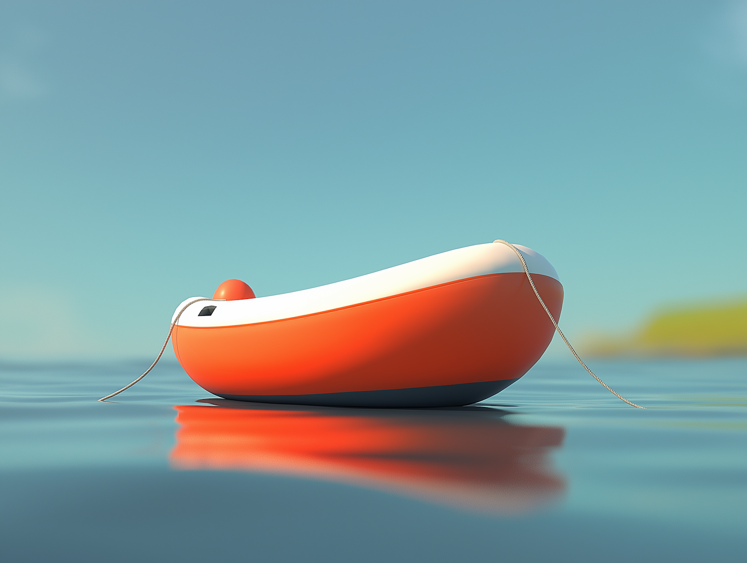 A vibrant orange and white boat floats on calm blue water, reflecting sunlight. A rope drapes over the side, with a serene sky above.