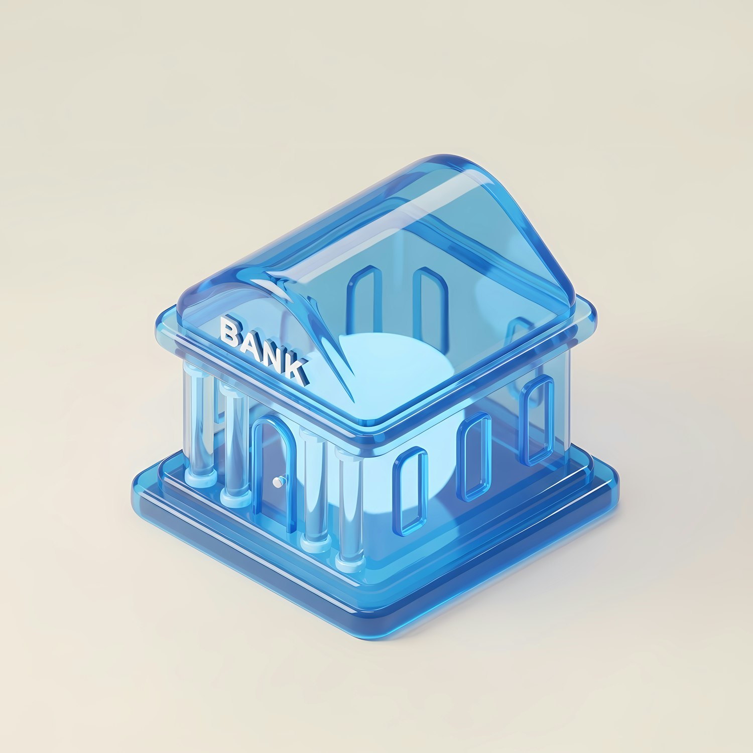 Stylized 3D illustration of a translucent blue bank building with classical columns and a modern design.