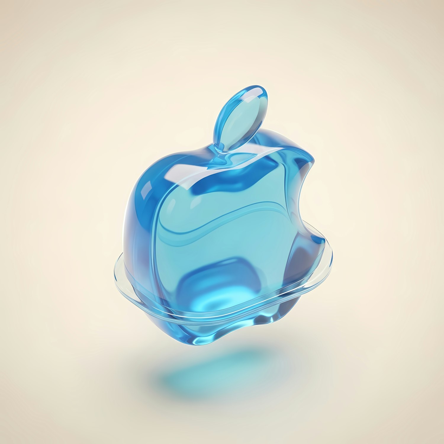 A sleek 3D-rendered translucent blue apple-shaped object with a reflective surface on a soft beige gradient background.