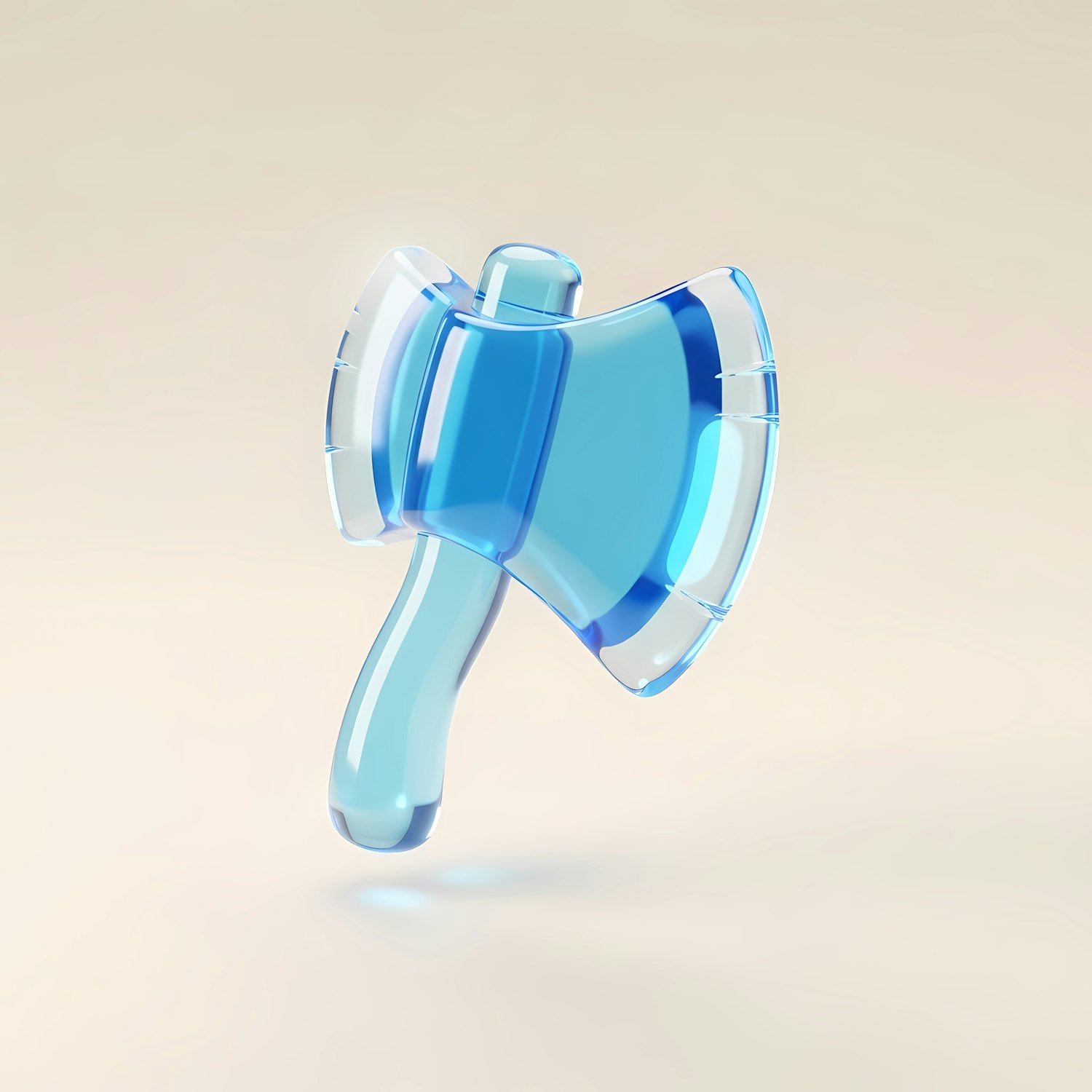 A sleek 3D-rendered translucent blue axe with a glossy finish, set against a soft beige gradient background.