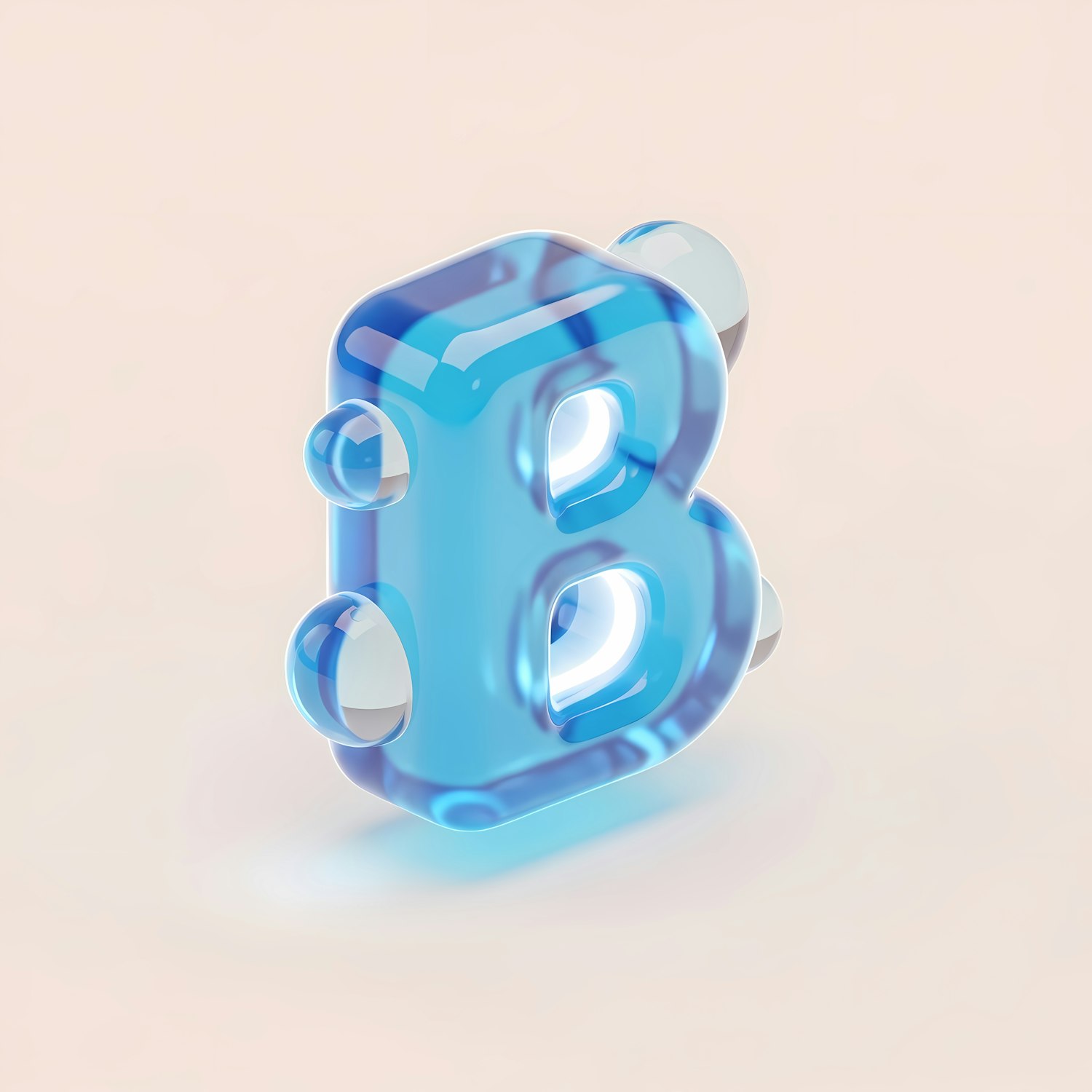 A 3D-rendered translucent blue letter 'B' with a glossy texture, glowing softly against a light beige background.