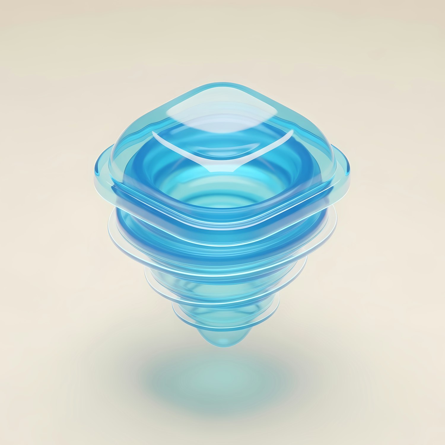 A sleek 3D-rendered abstract object with translucent blue layers, floating against a soft beige background, showcasing modern design.