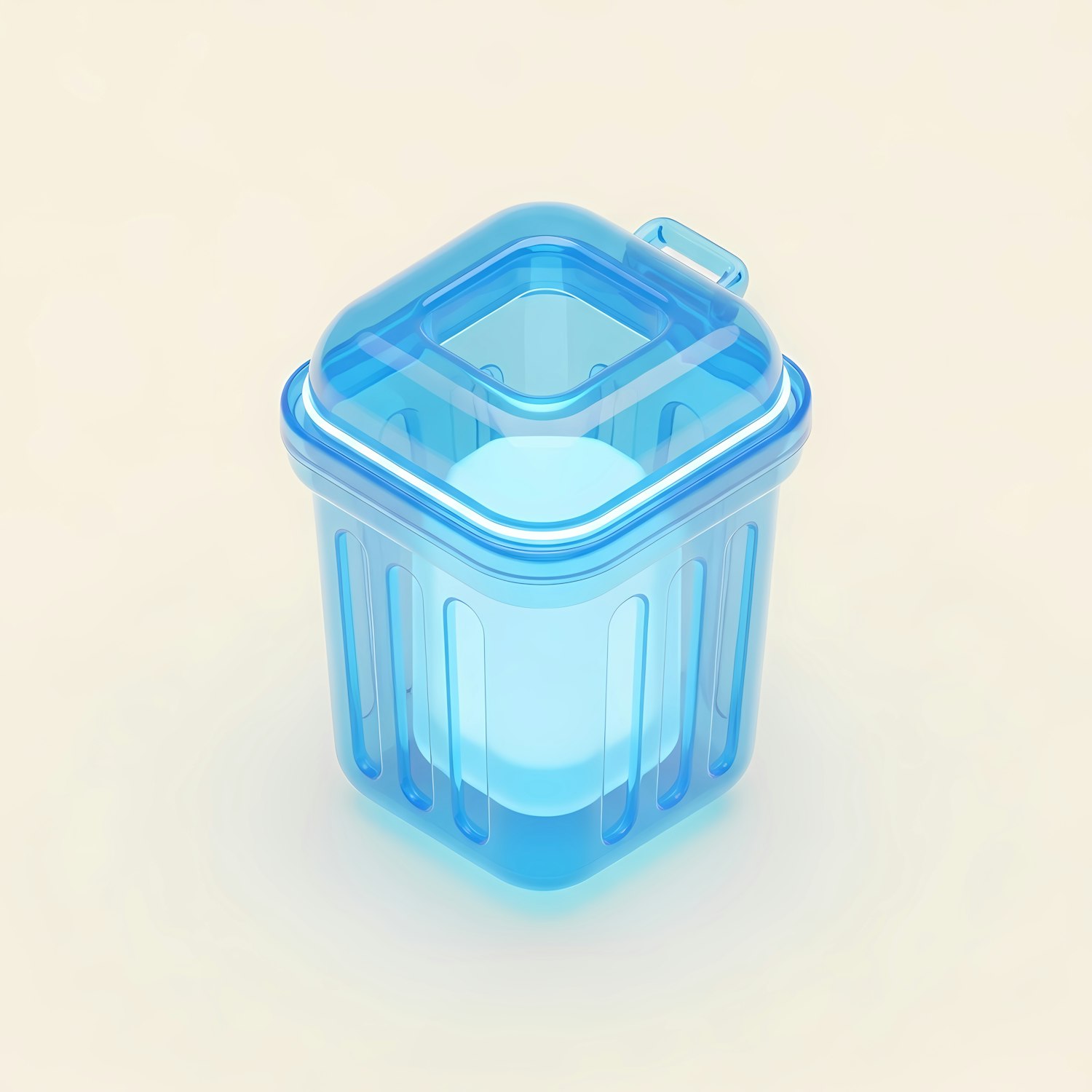 A sleek, translucent blue plastic container with a square lid and grooves, set against a soft beige background.