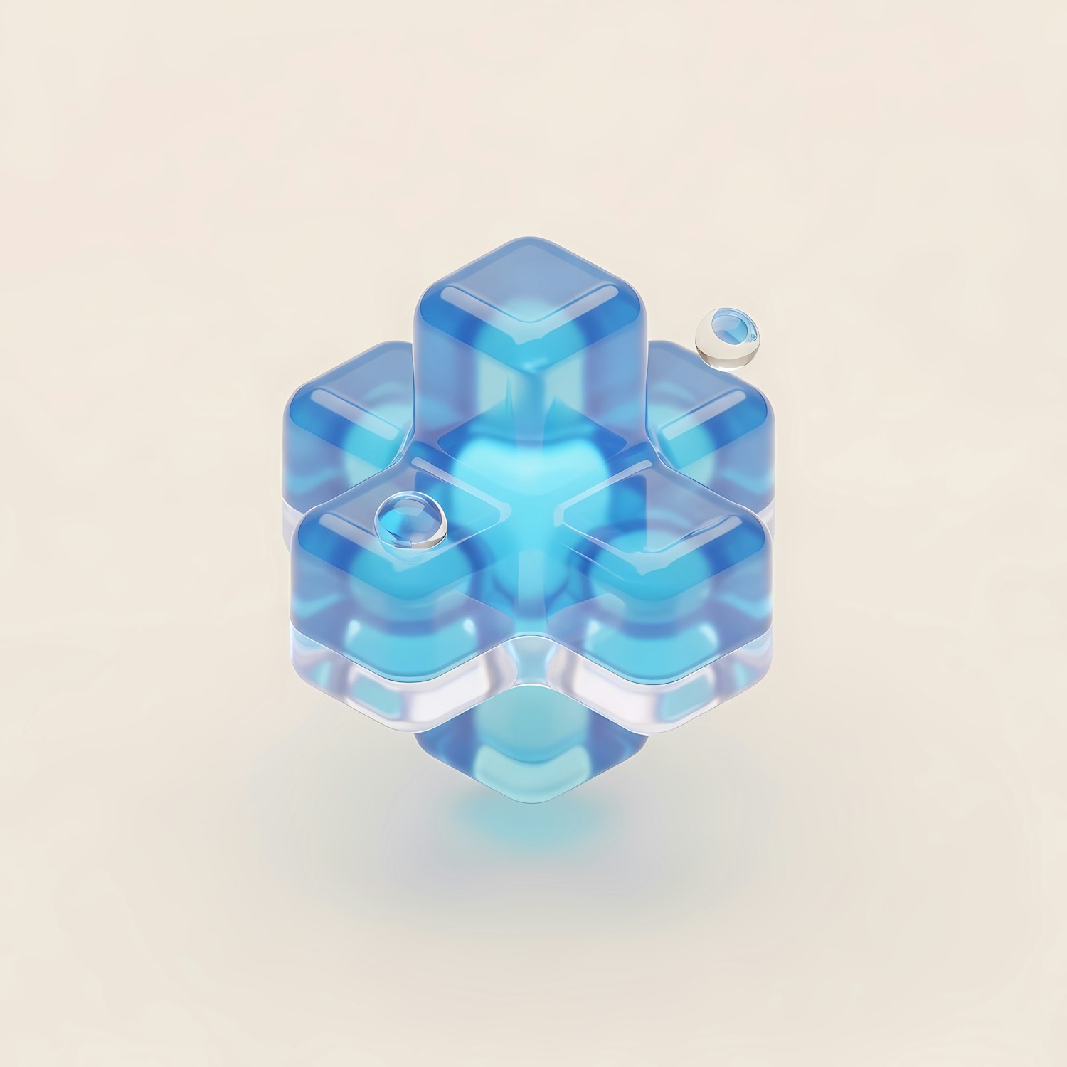 A 3D-rendered translucent blue cross with a glossy finish, floating against a soft beige background, accompanied by small spherical elements.