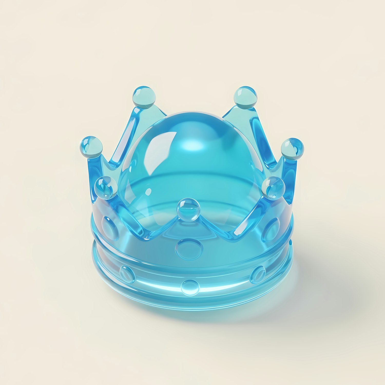 A glossy, translucent blue crown with rounded tips, set against a neutral background, showcasing its elegant and intricate design.