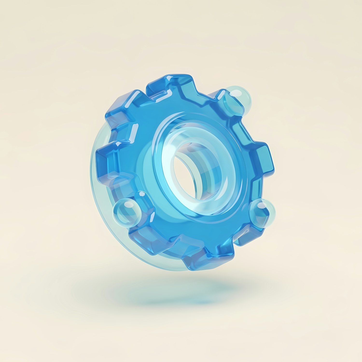 A translucent blue gear-shaped object with a glossy finish, floating against a soft beige background. Modern and minimalistic design.