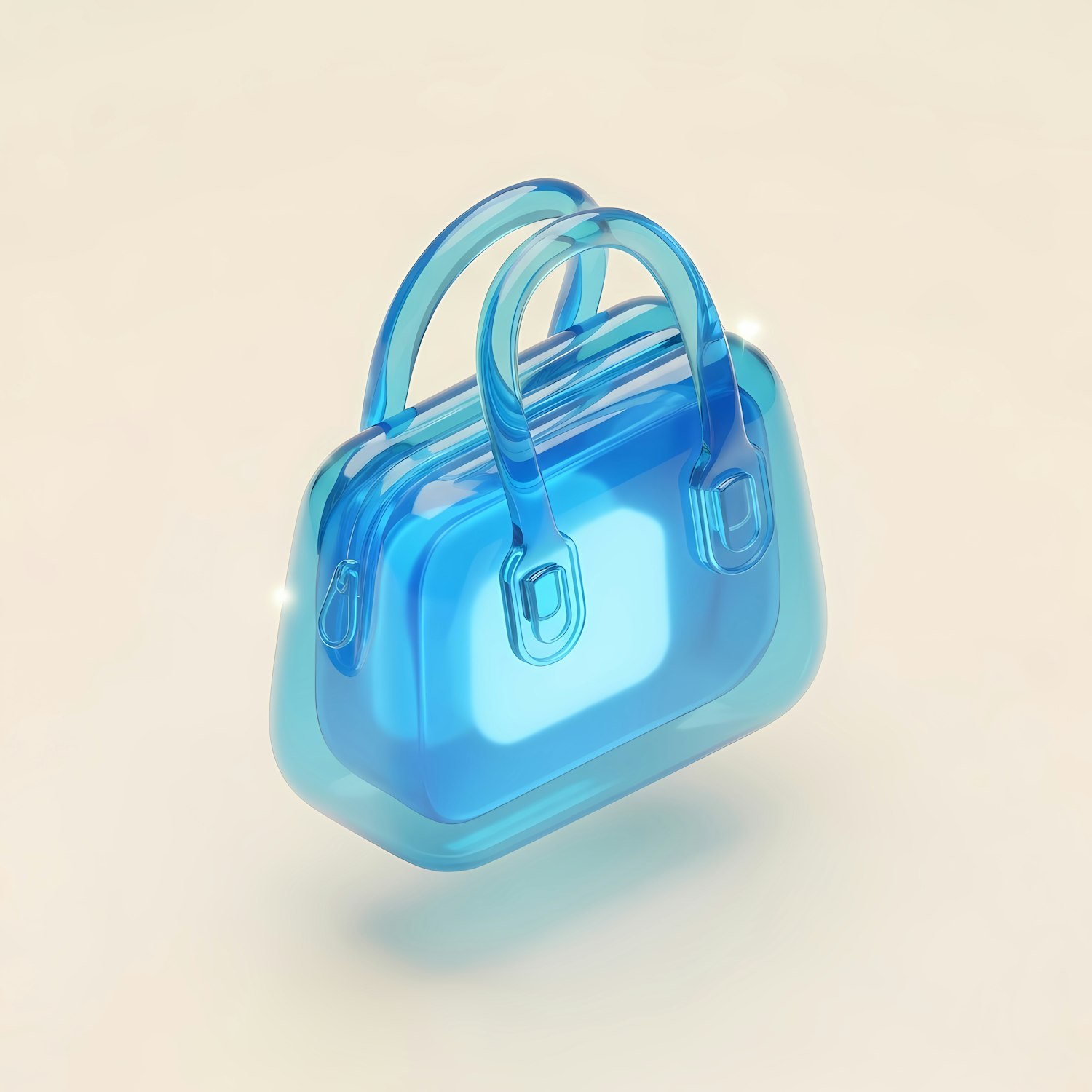 A sleek, translucent blue handbag with a glossy finish, floating against a soft beige background, showcasing modern design and elegance.