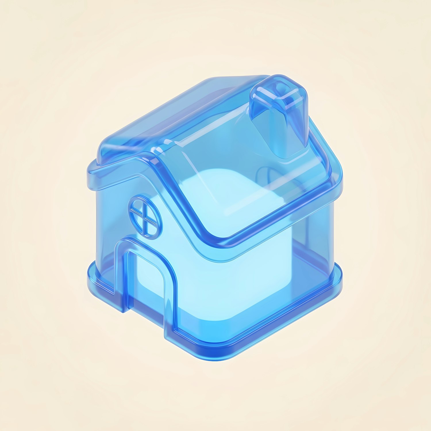 A sleek 3D-rendered translucent blue house with a modern design, set against a soft beige background. Perfect for creative concepts.