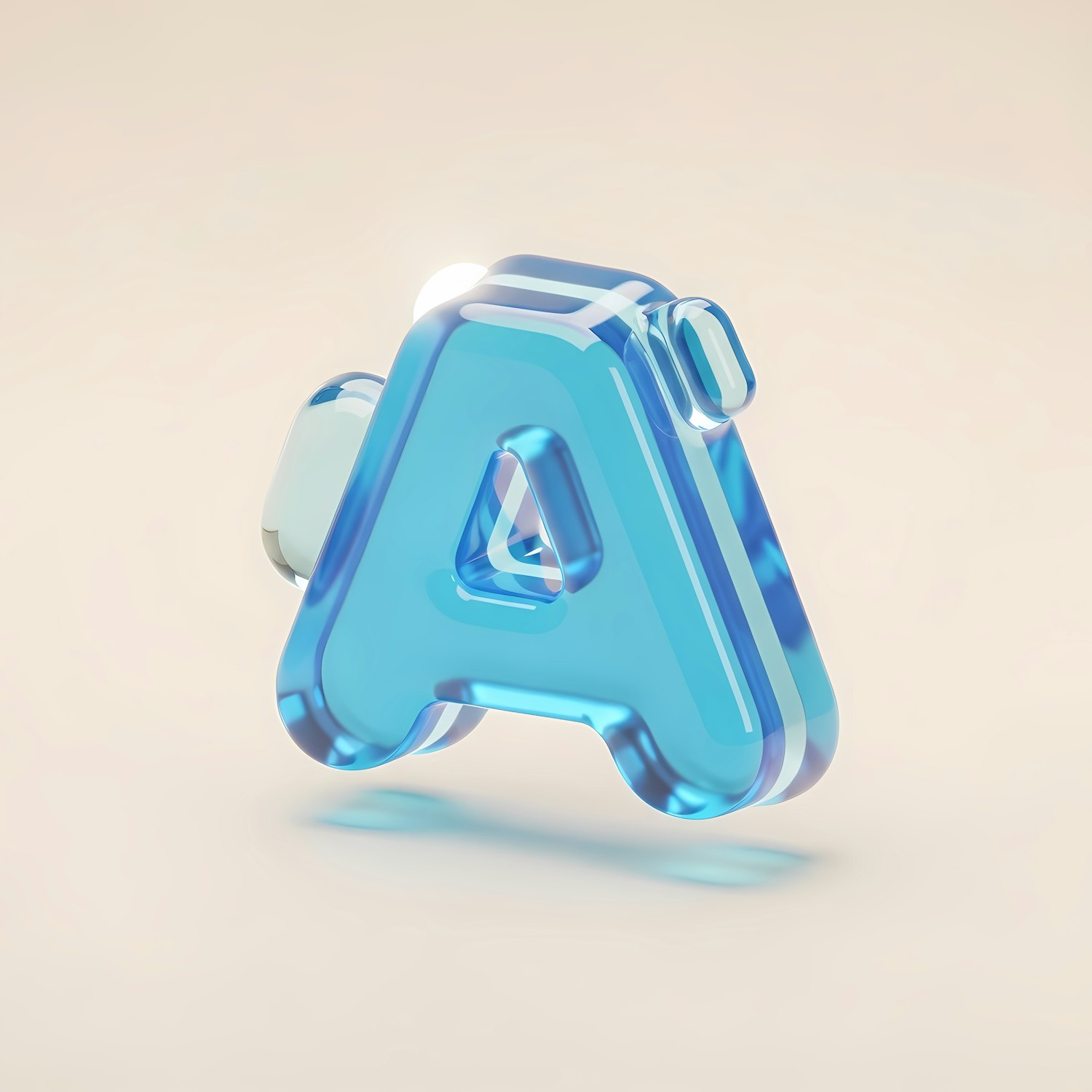 A sleek 3D-rendered translucent blue letter 'A' with a glossy finish, set against a soft beige background.