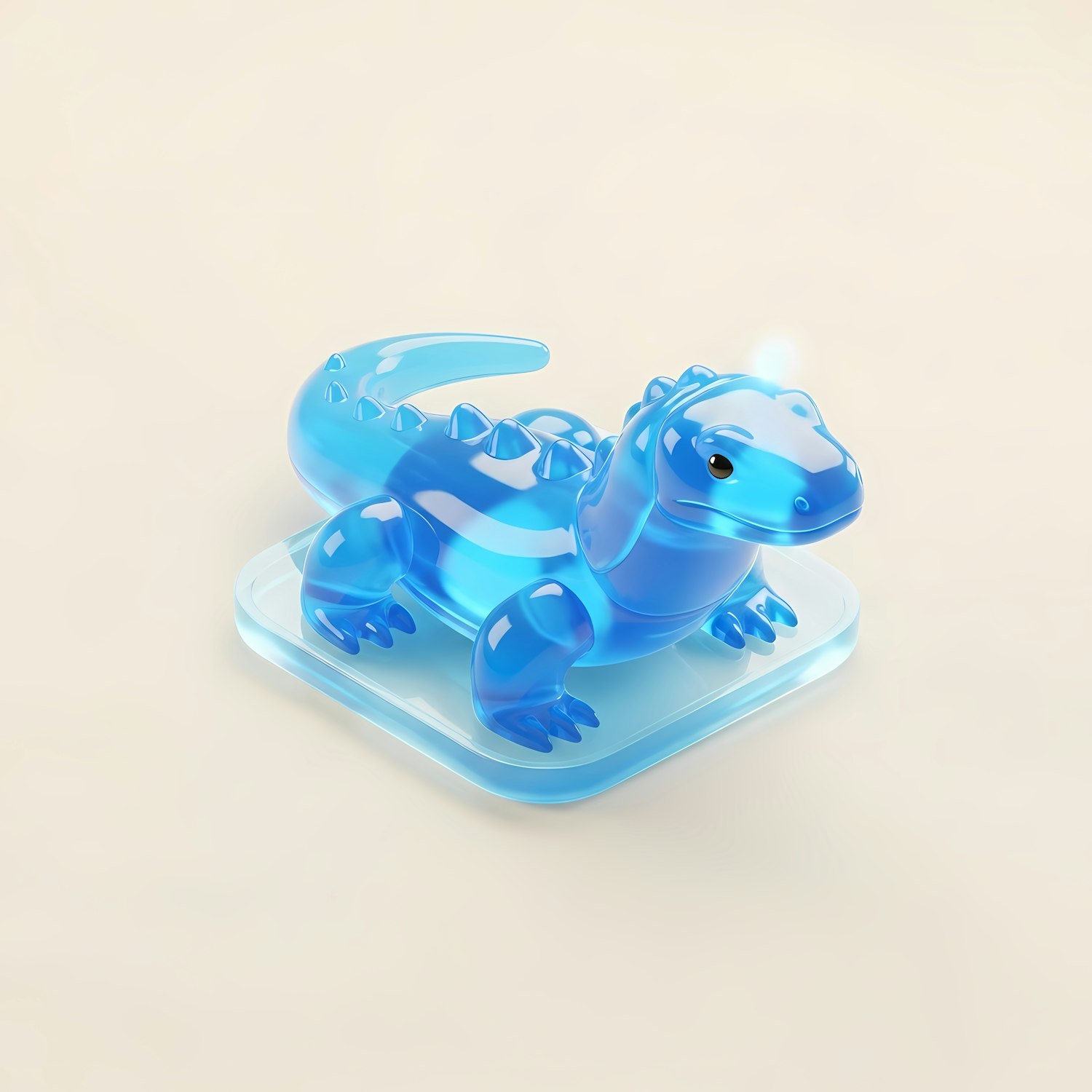 A vibrant 3D-rendered translucent blue lizard figurine on a matching platform, set against a soft beige background.