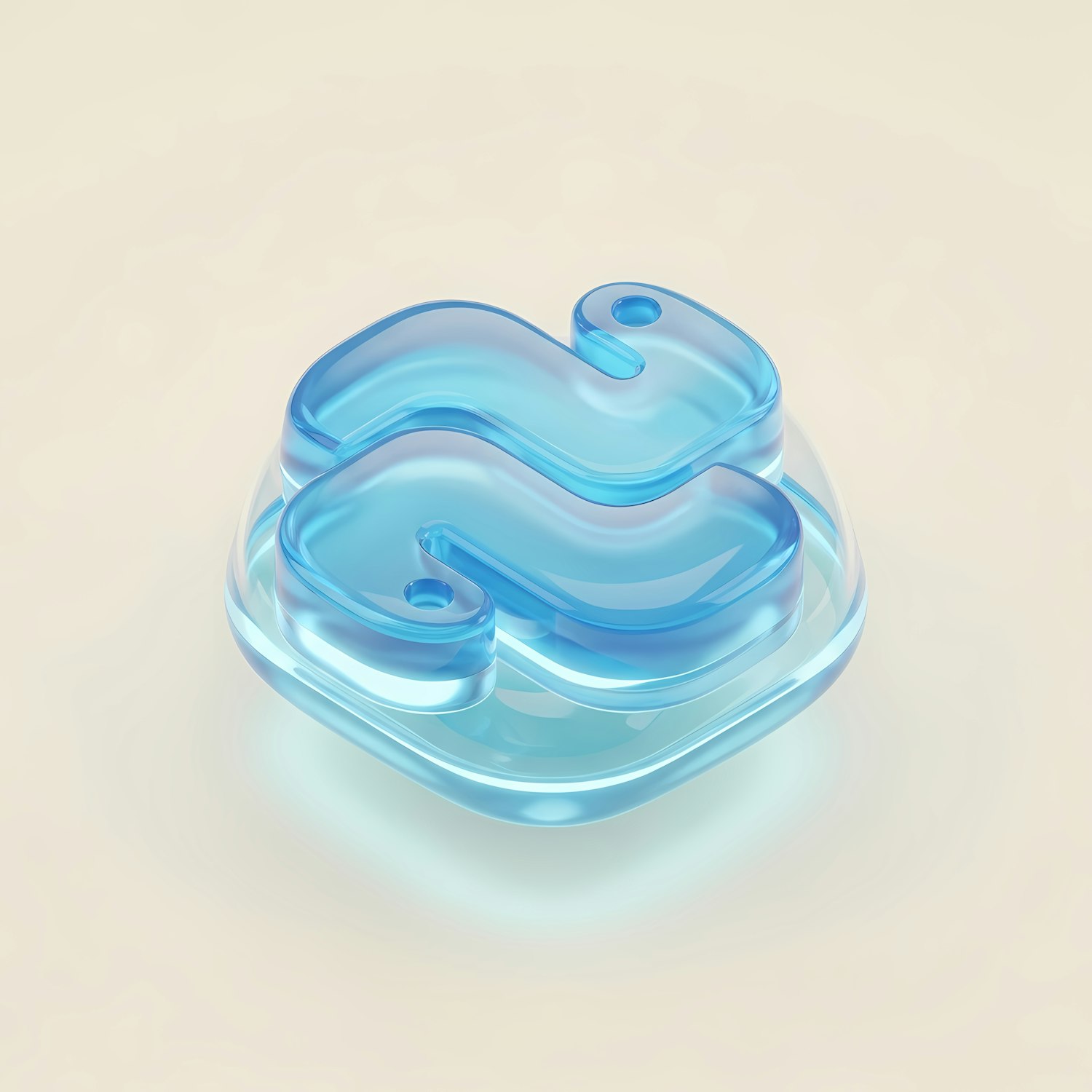 A sleek 3D-rendered translucent blue symbol with a glossy finish, set against a soft beige background for a modern aesthetic.