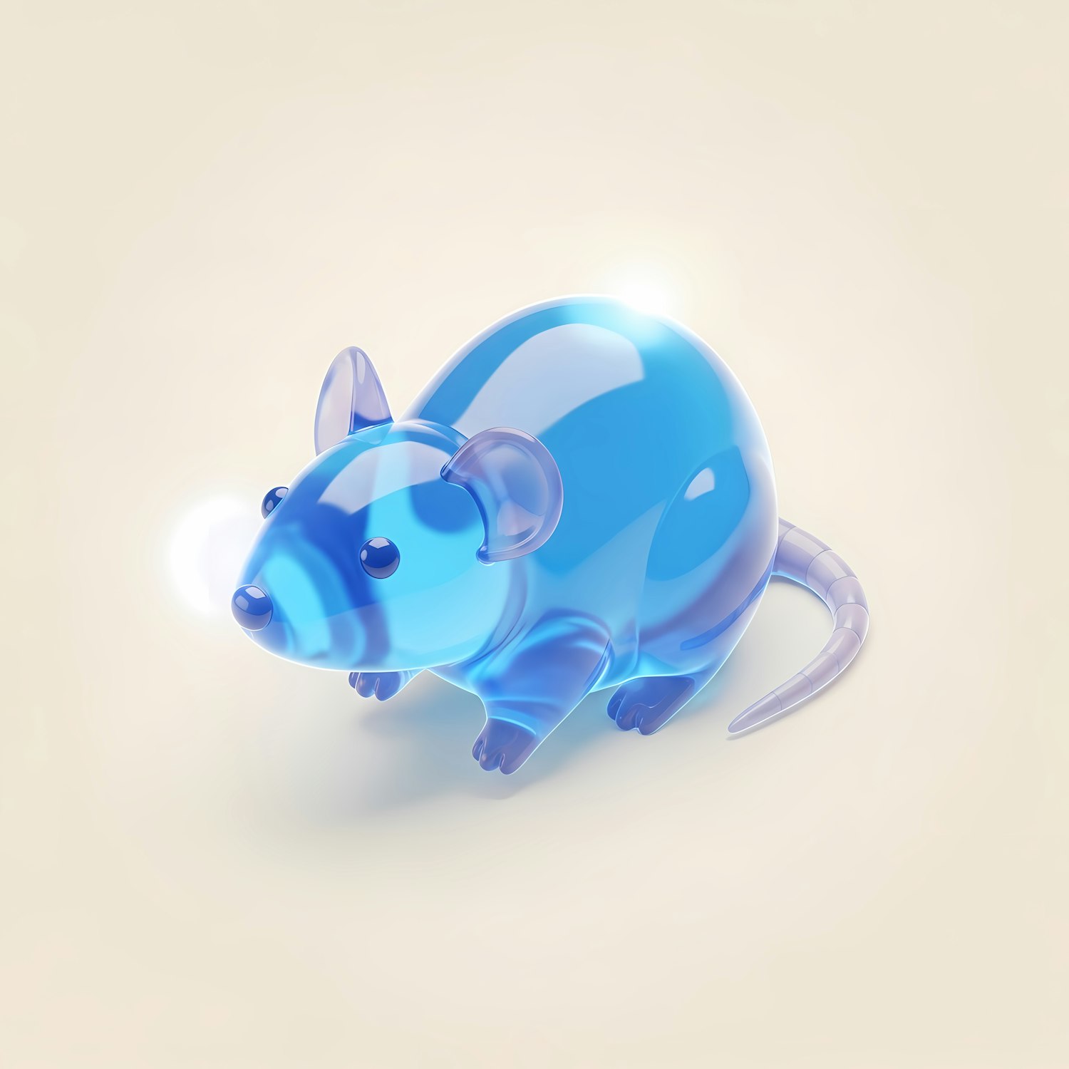 A 3D illustration of a translucent blue mouse with a glossy, glass-like texture on a soft beige background.