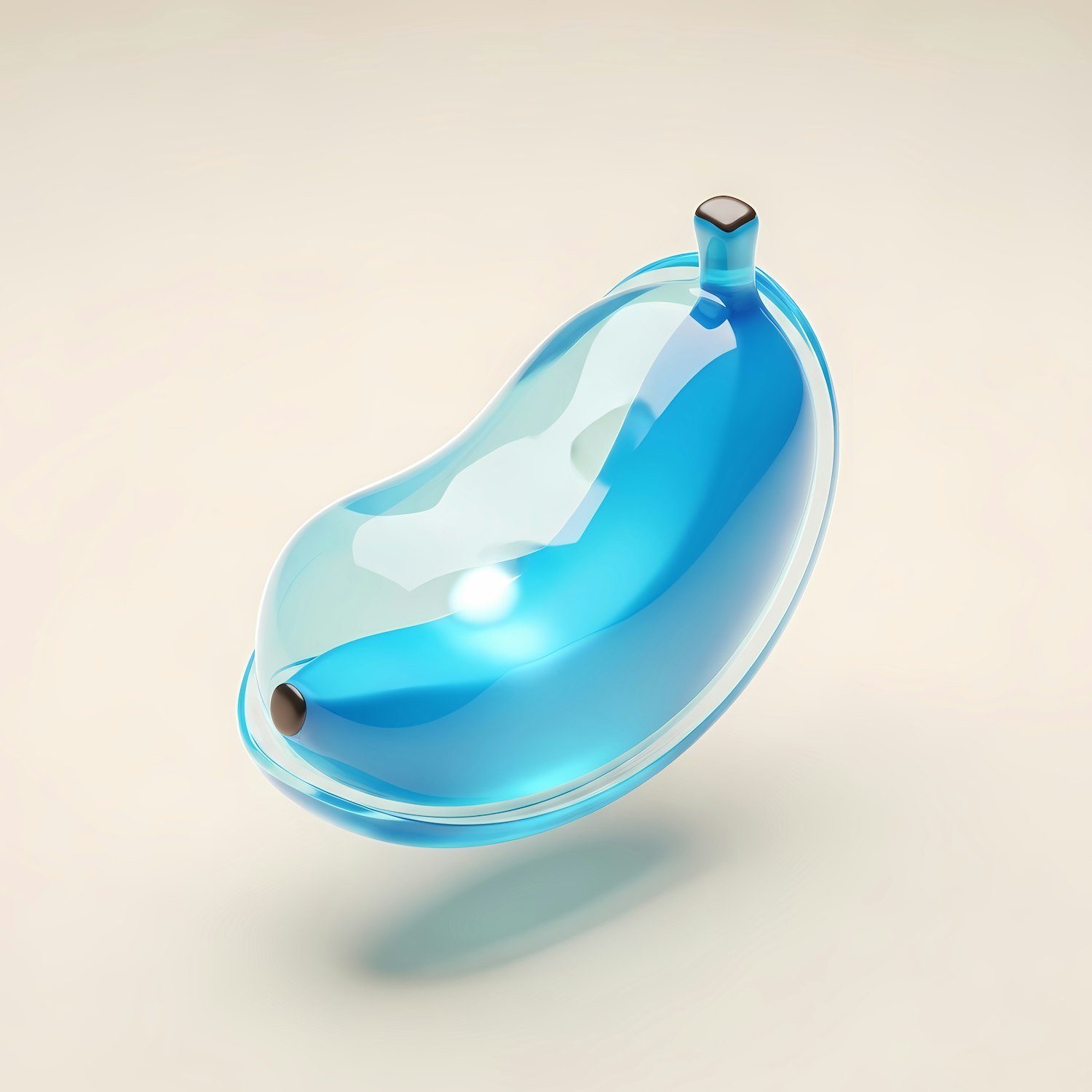 A sleek 3D-rendered translucent blue pod with a glossy finish, floating against a neutral background. Modern and minimalistic design.