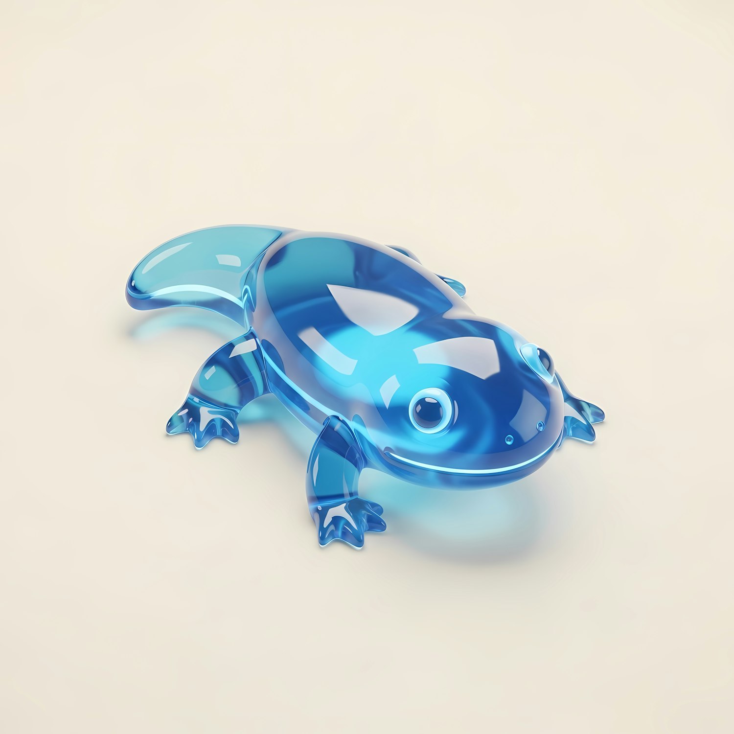 A glossy, translucent blue salamander-like 3D model on a light beige background, showcasing smooth textures and reflective surfaces.