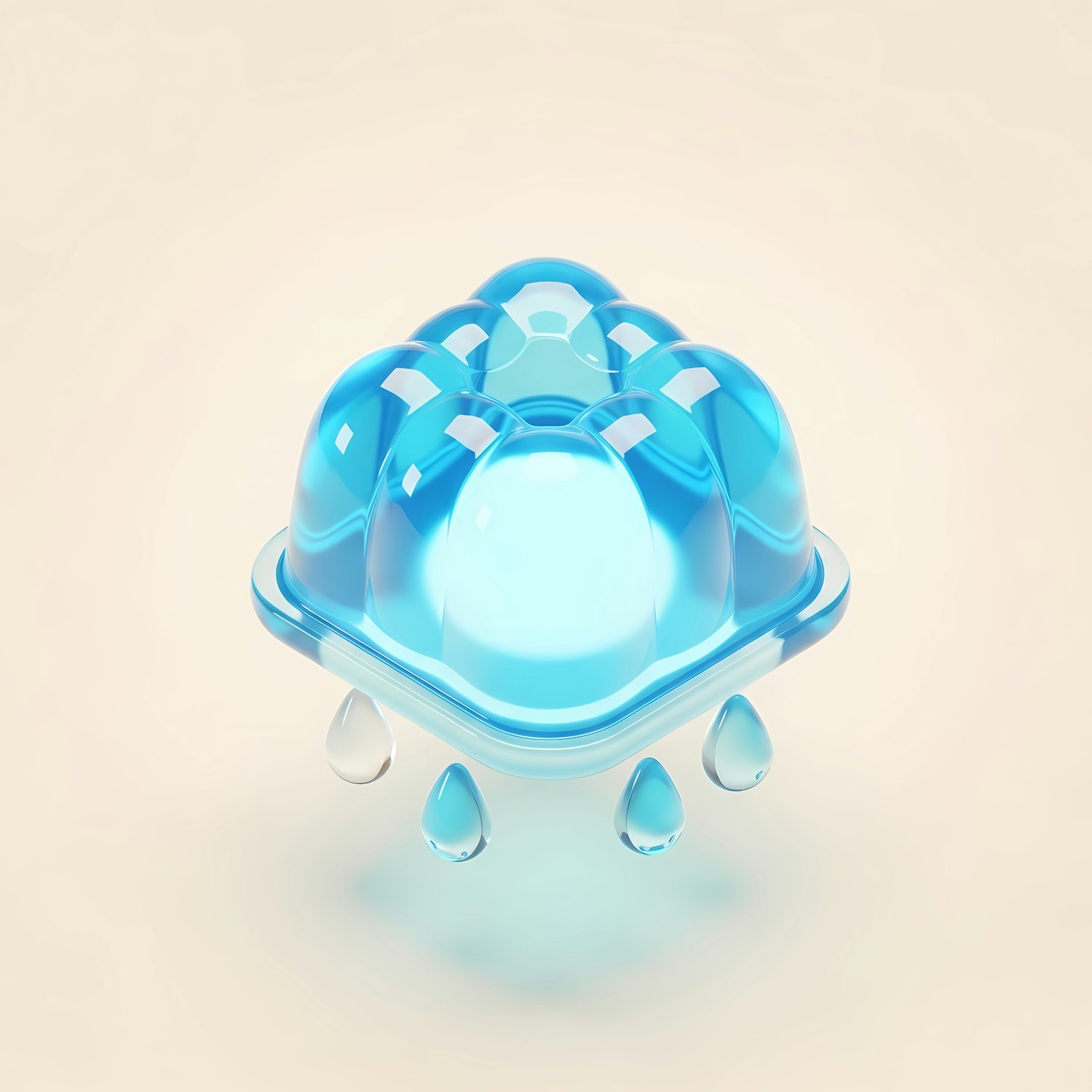 A 3D-rendered translucent blue jelly-like object with teardrop droplets, set against a soft beige gradient background.
