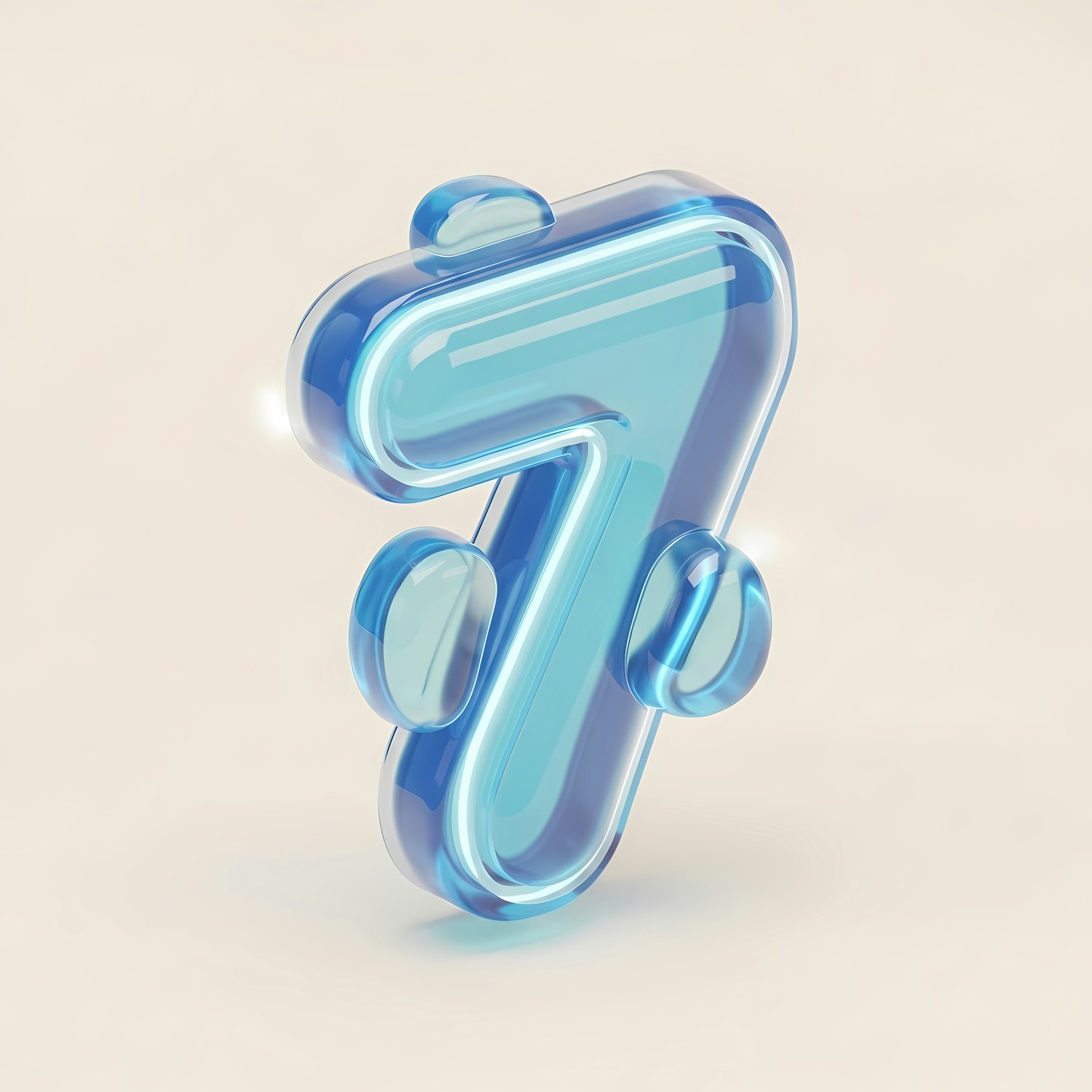 A 3D-rendered translucent blue number seven with a glossy finish, featuring bubble-like accents, set against a soft beige background.