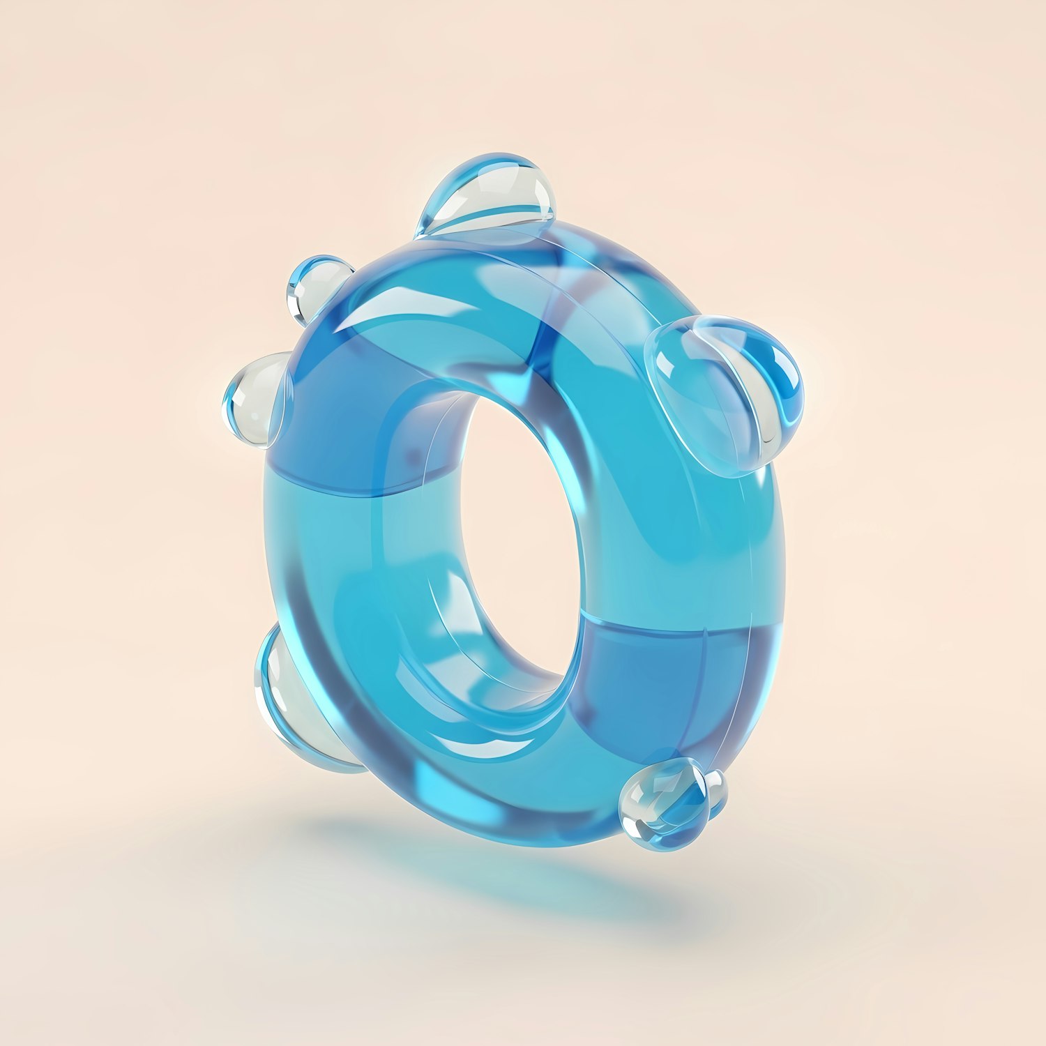 A 3D-rendered translucent blue torus with water-like droplets on a soft beige background, showcasing a glossy and reflective texture.
