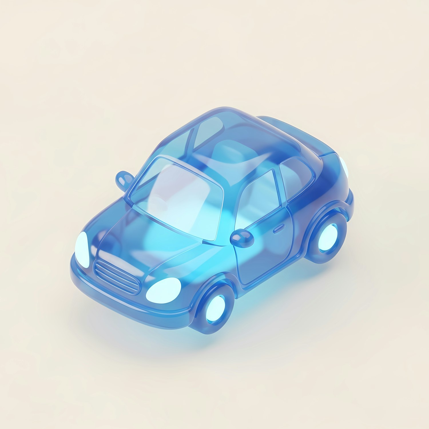 A cute, translucent blue toy car in a 3D-rendered style, set against a soft beige background. Perfect for playful or design themes.