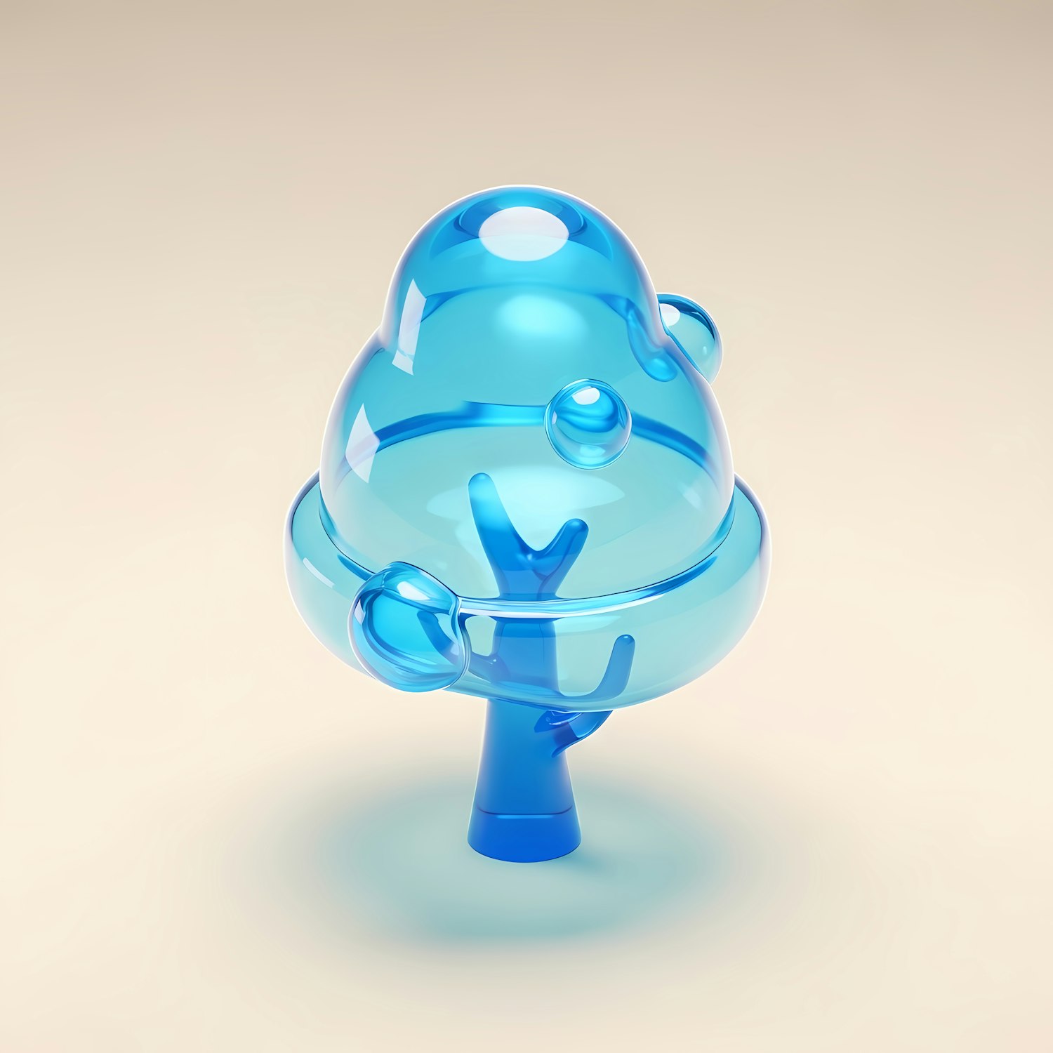 A 3D-rendered translucent blue tree with a rounded, layered canopy and bubble-like details, set against a soft beige background.