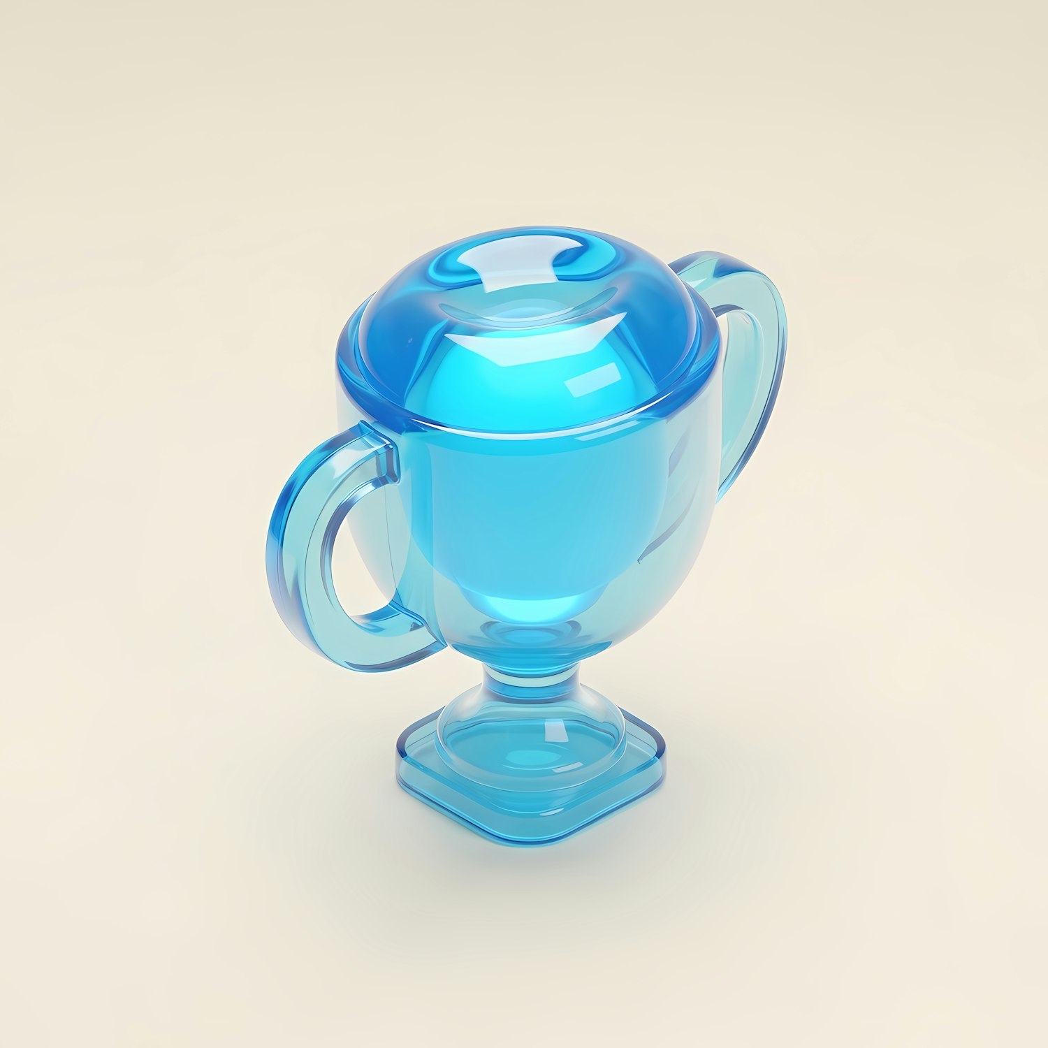 A translucent blue trophy with a glossy finish, featuring a rounded body and two handles, set against a soft beige background.