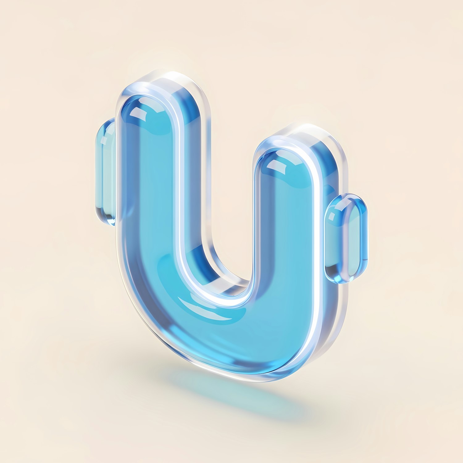 A 3D-rendered translucent blue letter 'U' with a glossy finish, set against a soft beige background, showcasing a modern and sleek design.