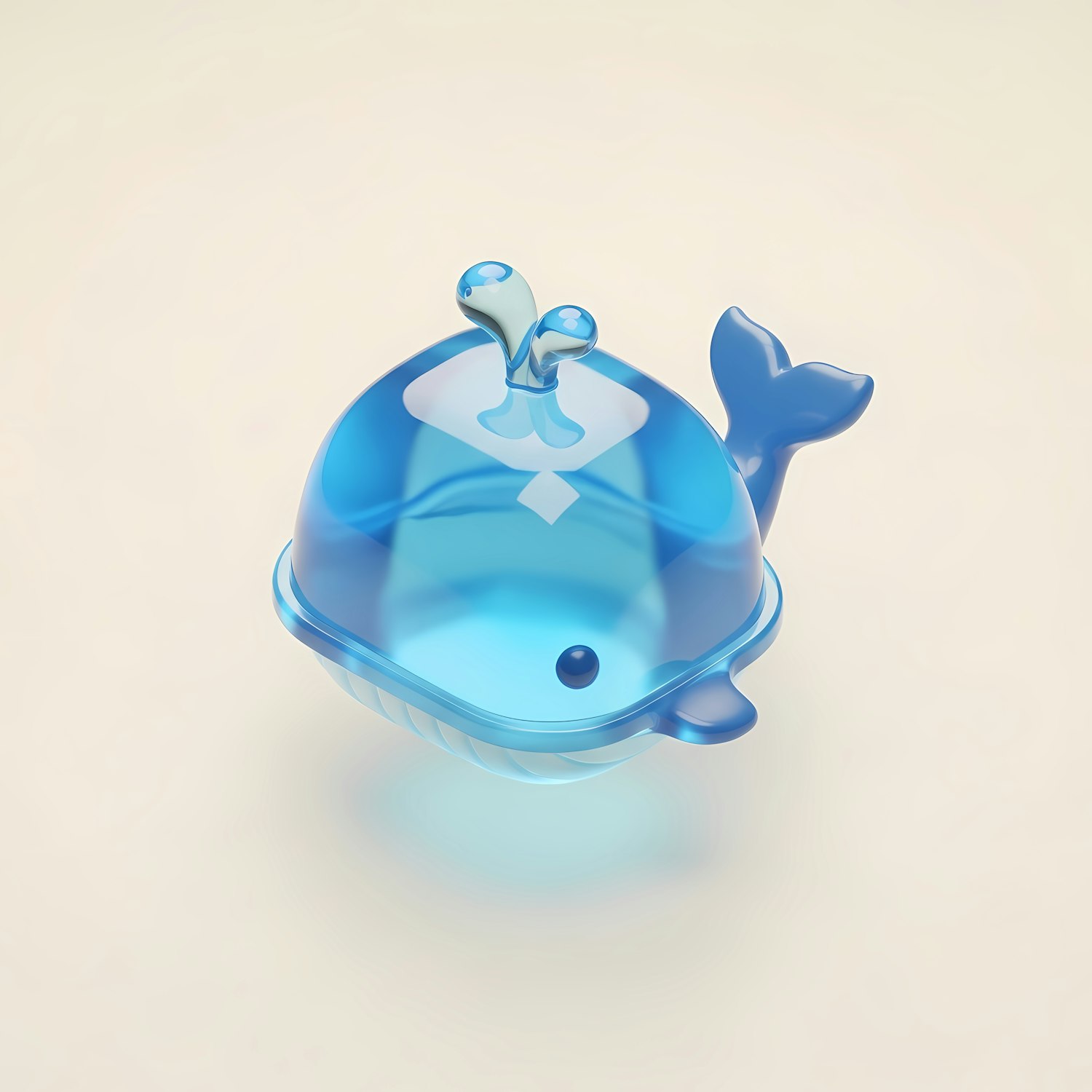 A 3D-rendered translucent blue whale figurine with a glossy finish and a playful water spout, set against a soft beige background.