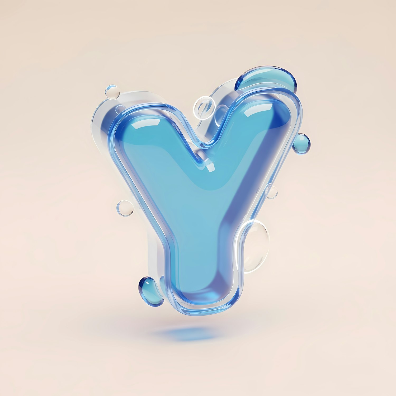 A 3D-rendered translucent blue letter 'Y' with a glossy texture, surrounded by bubbles, set against a soft beige gradient background.