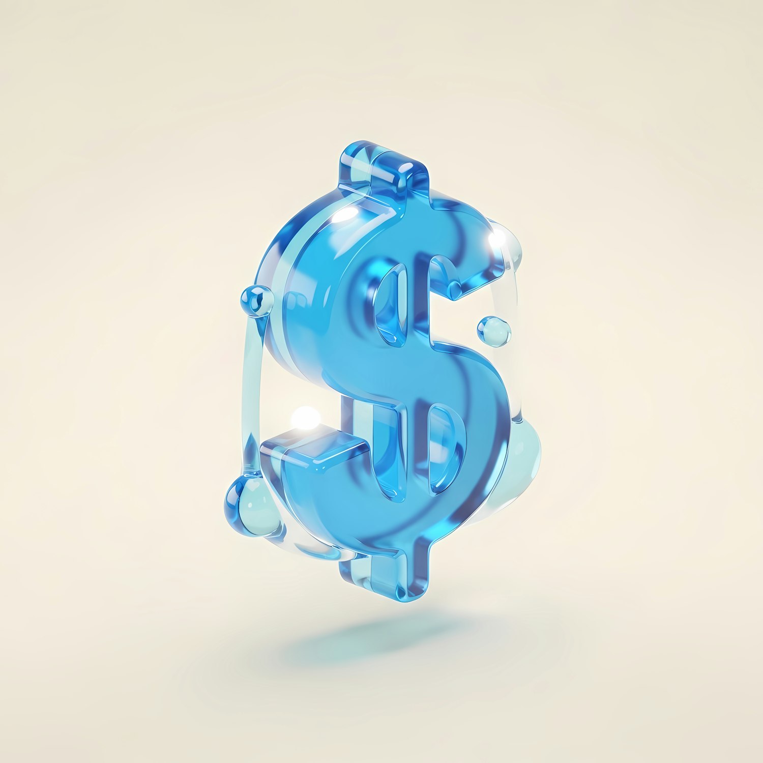 A glossy, translucent blue dollar sign in 3D, floating against a soft beige background. Perfect for finance or investment themes.