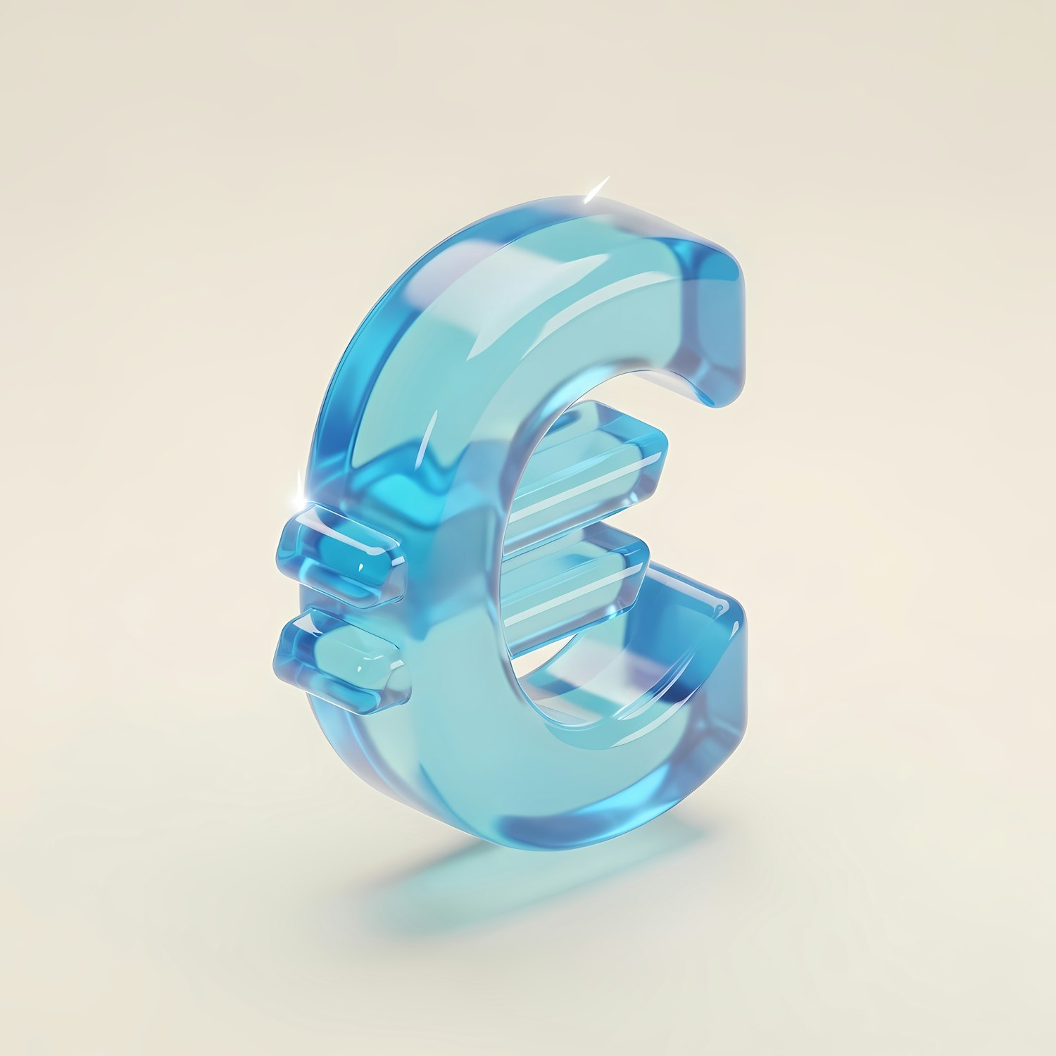A sleek 3D euro symbol in translucent blue with a glossy finish, set against a soft beige background. Modern and eye-catching design.