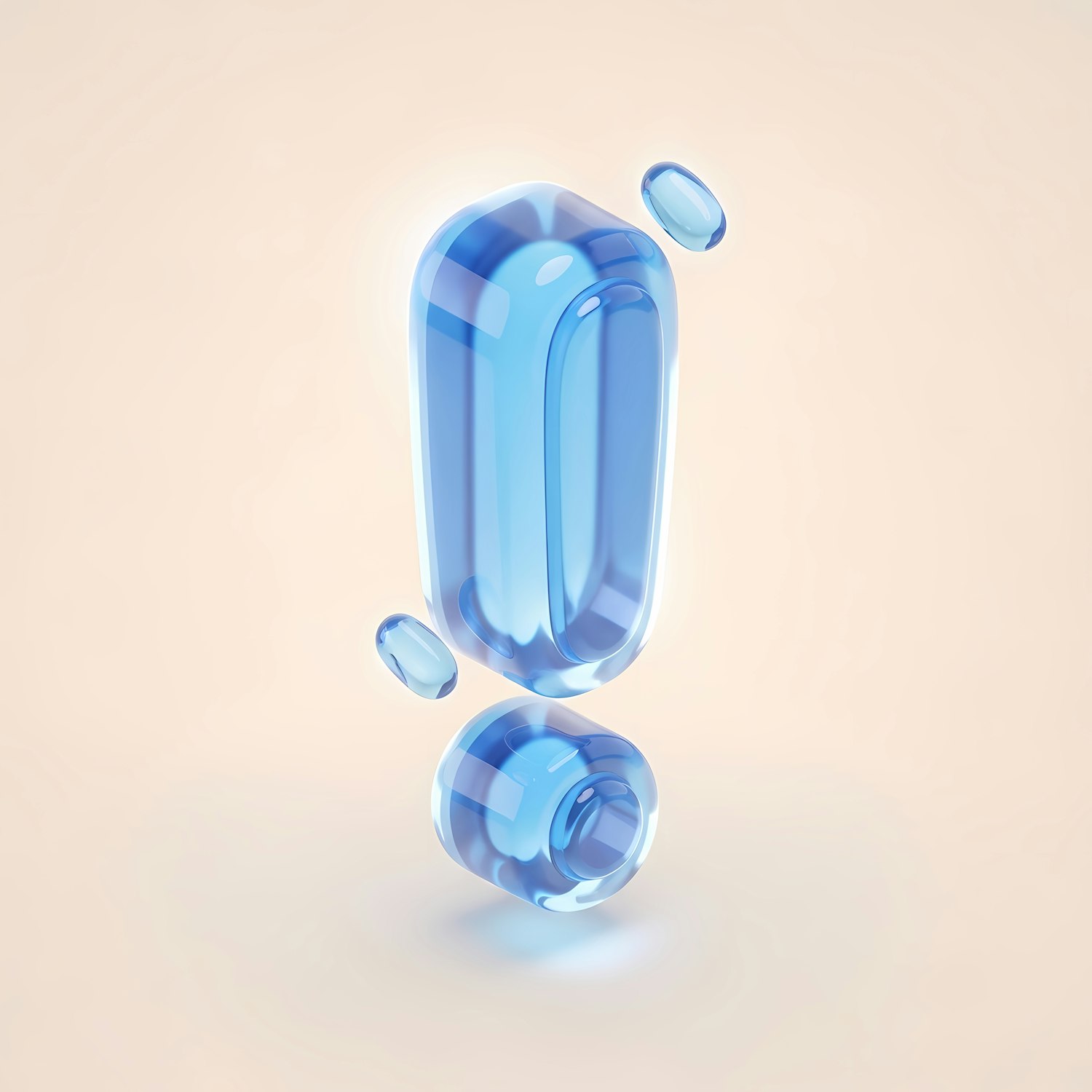 A 3D-rendered translucent blue exclamation mark floating on a soft beige background, showcasing a sleek and modern design.