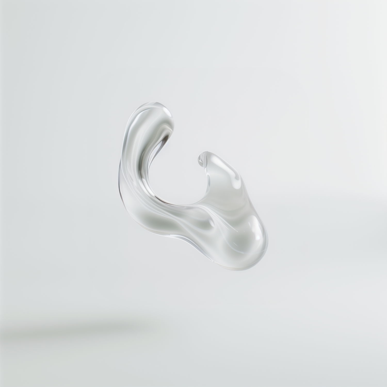 Translucent abstract shape with fluid curves on a light gray background, resembling a liquid or glass sculpture.