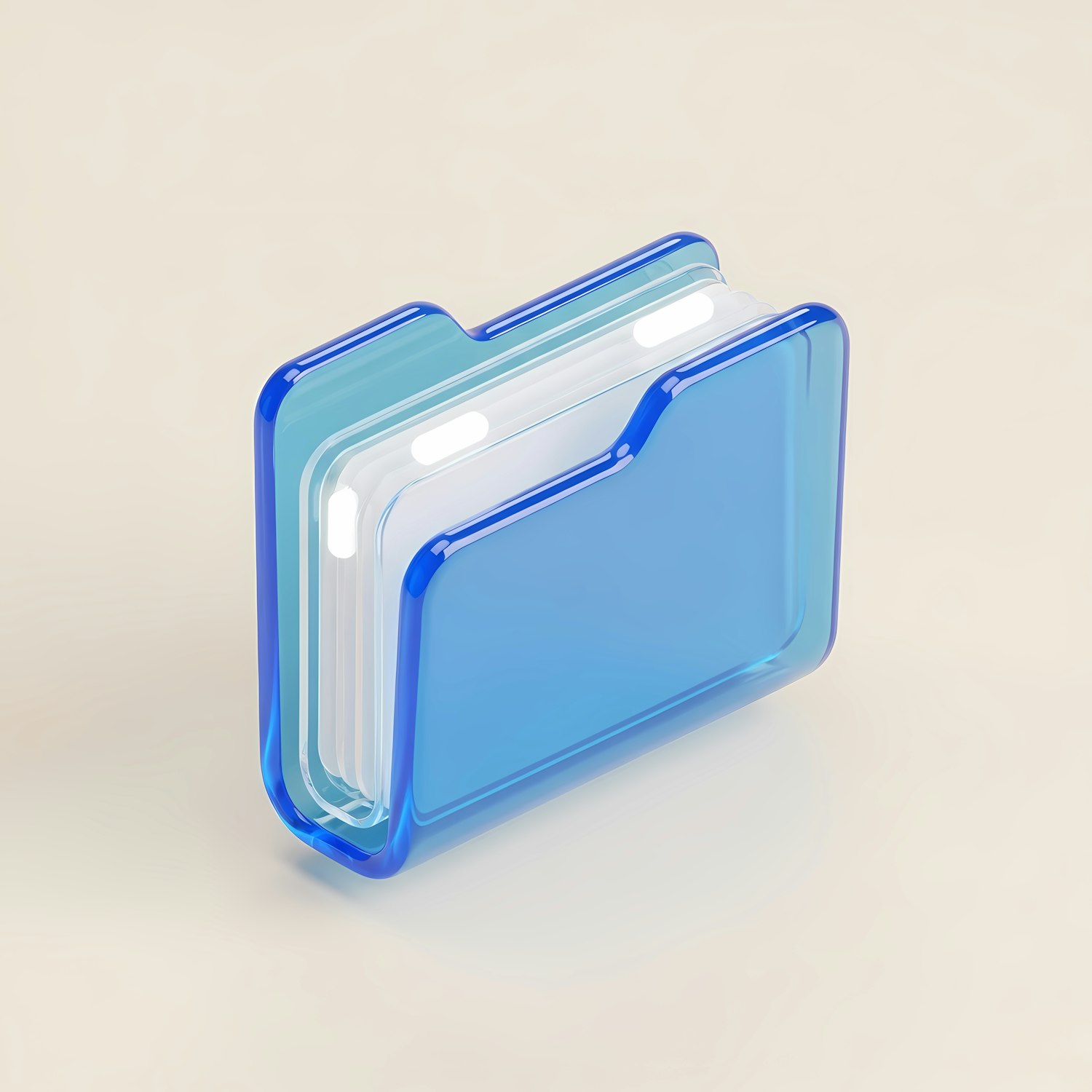 3D-rendered translucent blue folder icon with a layered design on a neutral beige background.