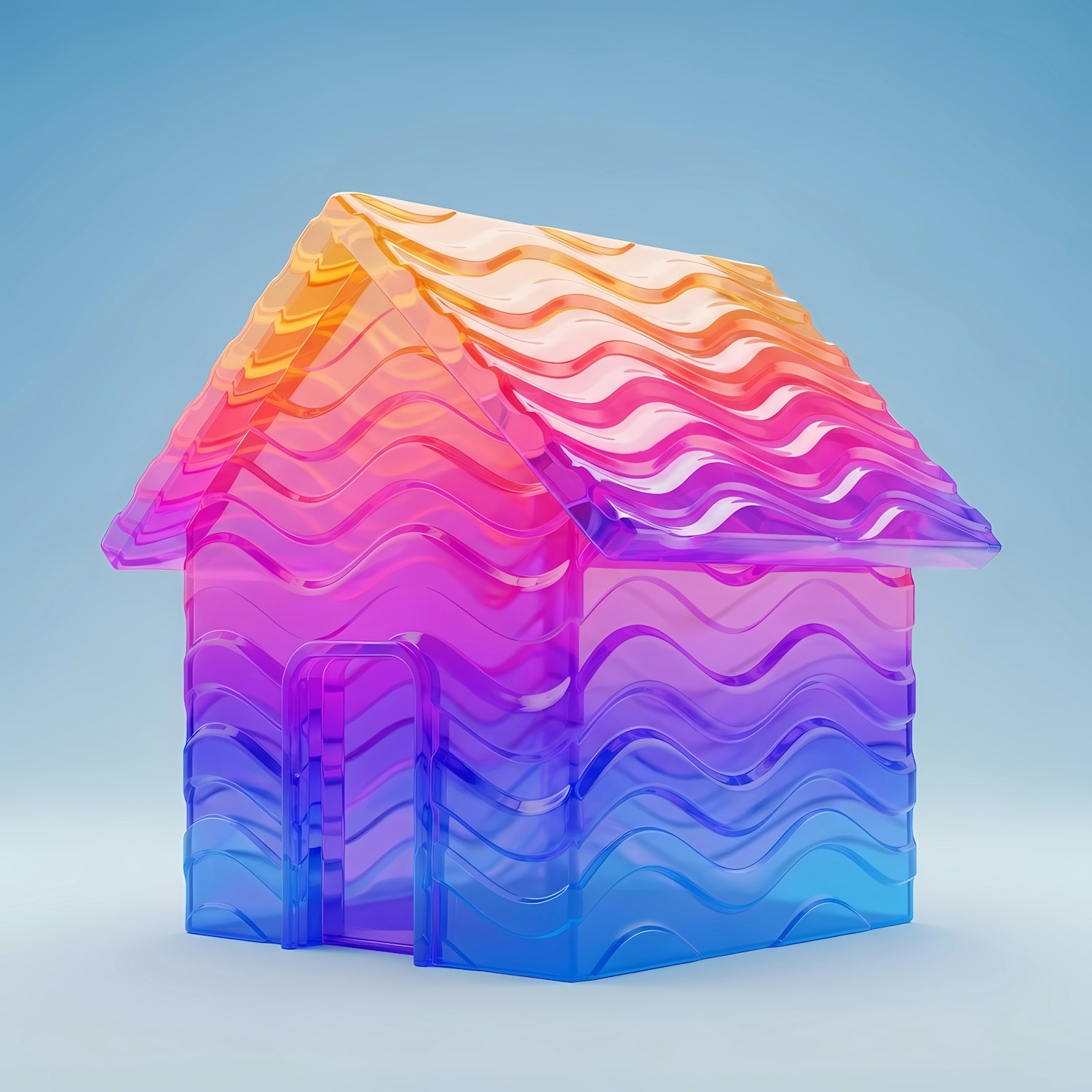A colorful 3D-rendered house with wavy patterns and a gradient from orange to blue, set against a soft blue background.
