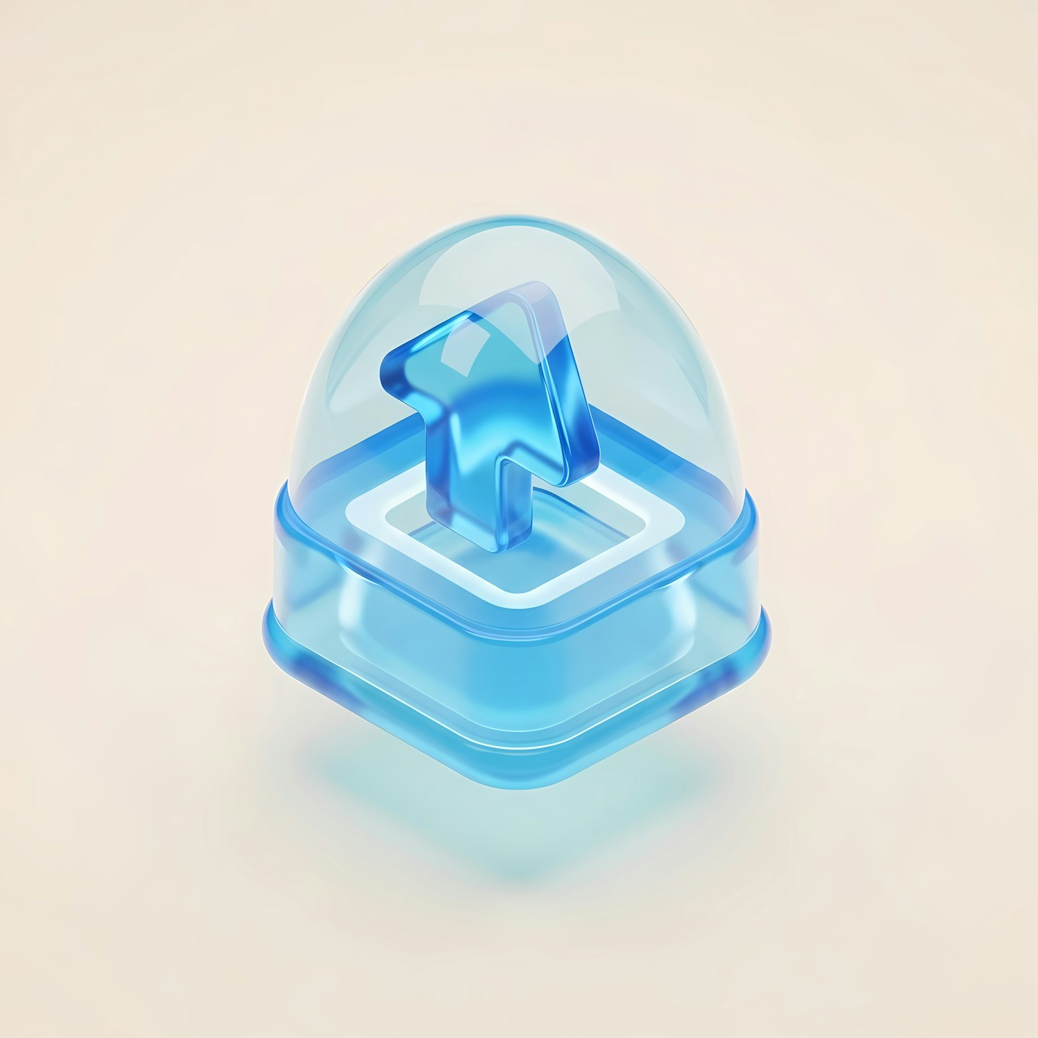 3D-rendered translucent blue keycap with an upward arrow symbol, encased in a dome, on a soft beige background.