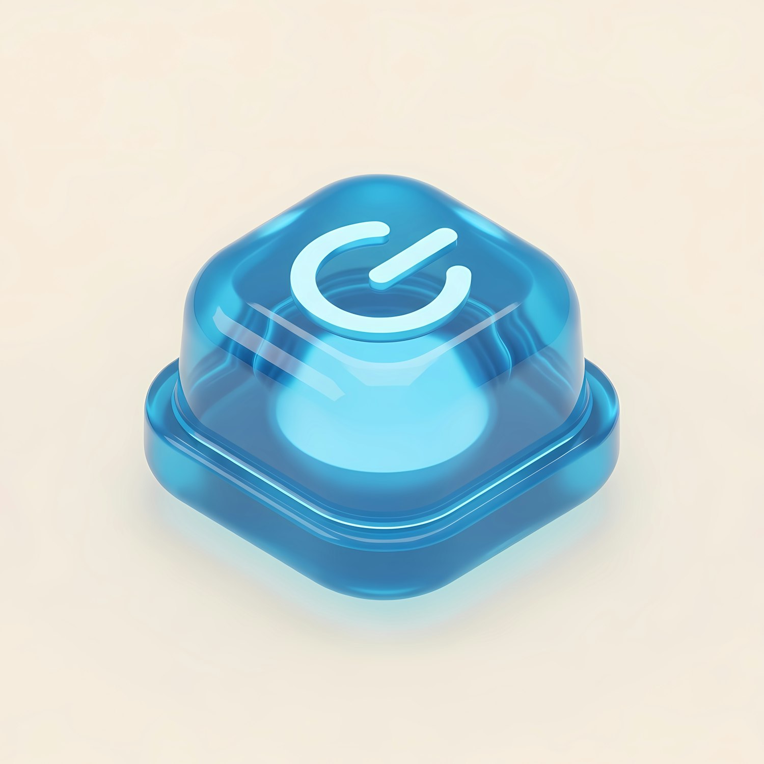Glossy blue 3D power button with a glowing symbol, set against a soft beige background. Sleek and modern design for tech themes.