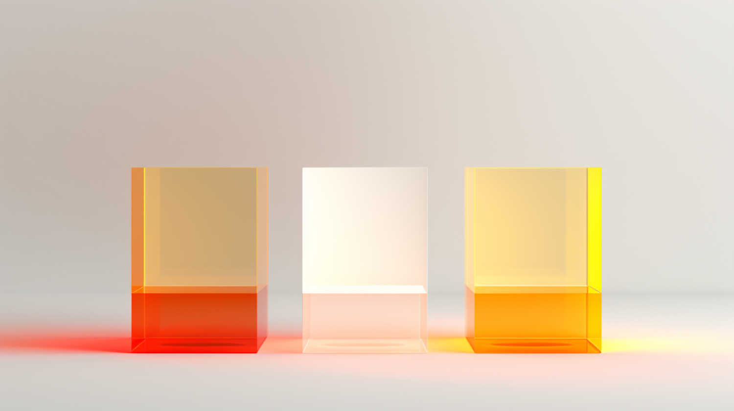 Three colorful transparent blocks in red, clear, and yellow on a neutral background, casting vibrant reflections.
