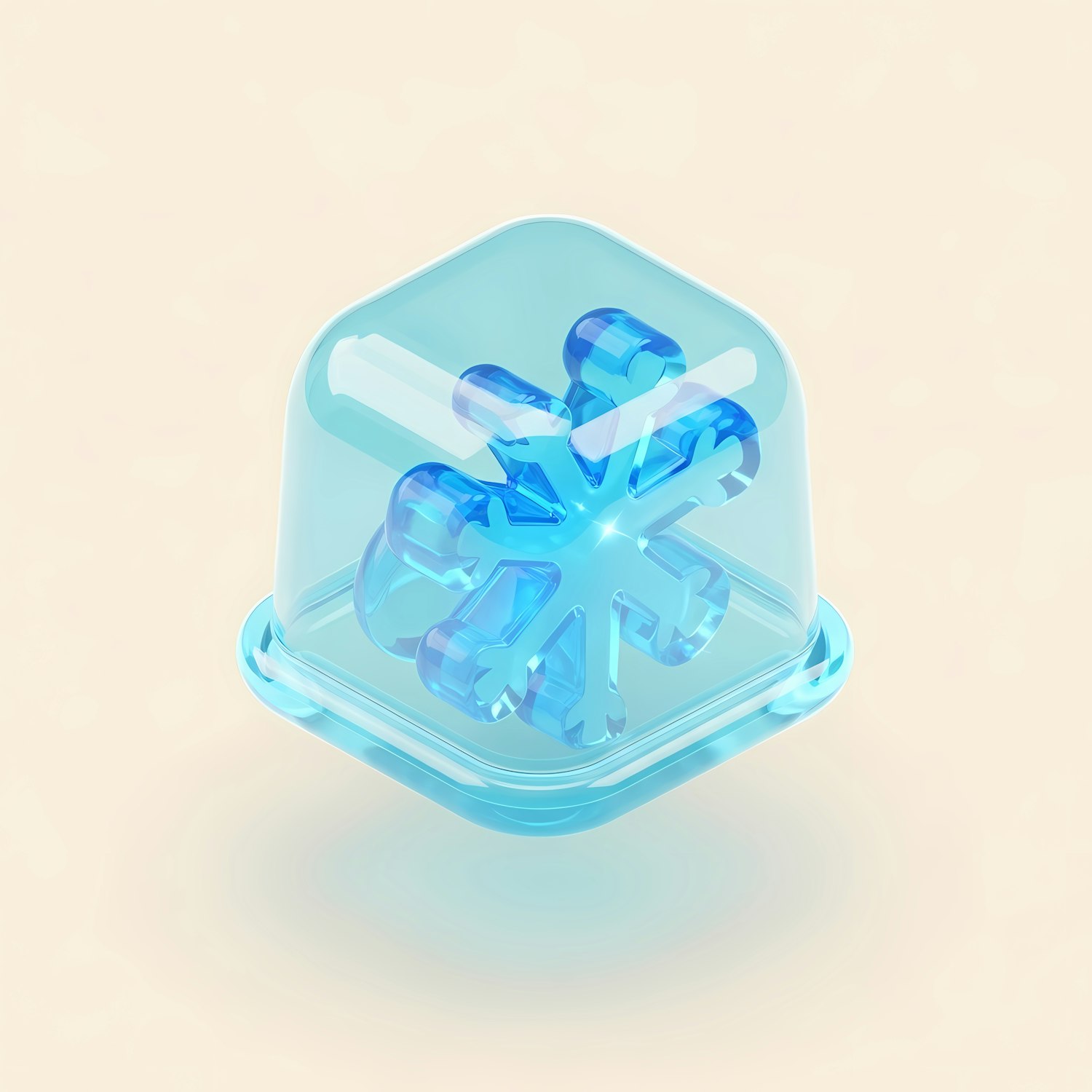 A 3D-rendered blue snowflake encased in a clear dome, set against a soft beige background, showcasing intricate and glossy details.