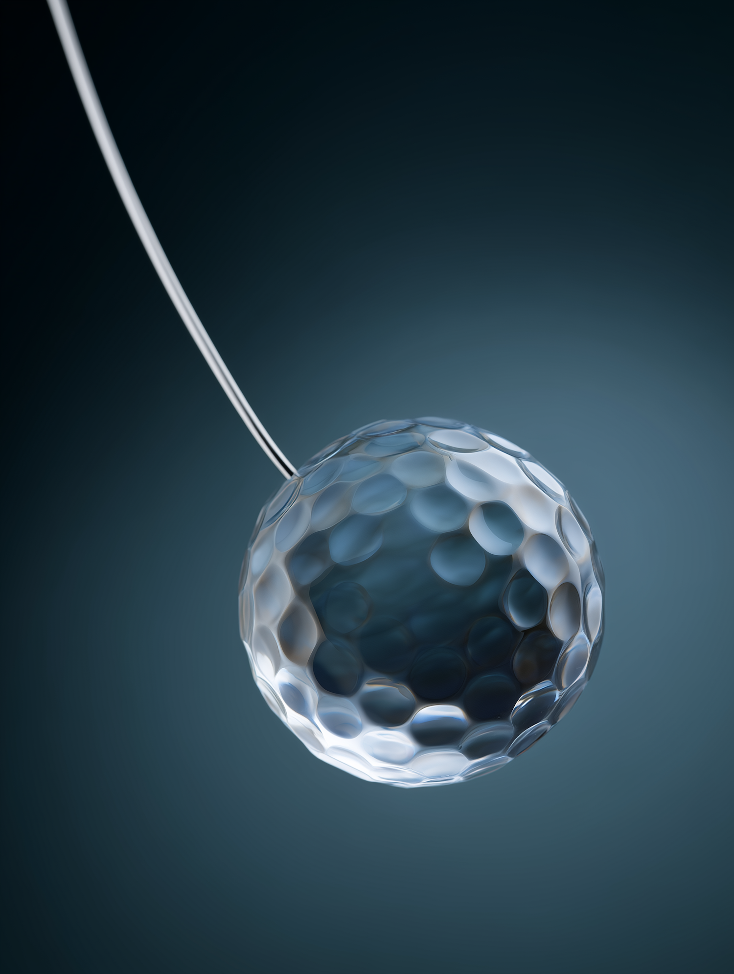 A translucent, dimpled sphere suspended by a wire against a dark blue gradient background, showcasing intricate light reflections.