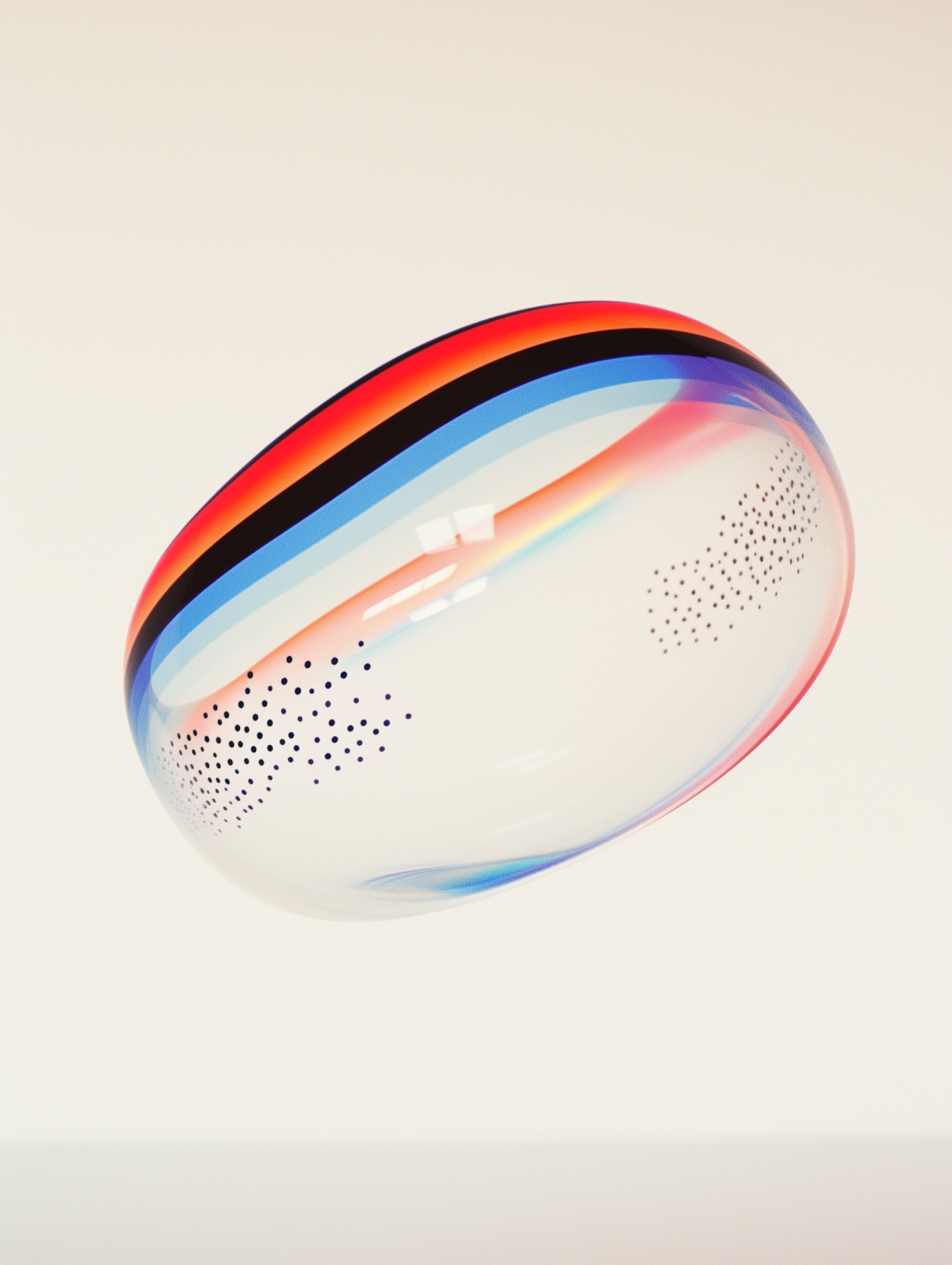 A vibrant, translucent sphere with colorful bands and dots floats against a plain background, creating a striking visual contrast.