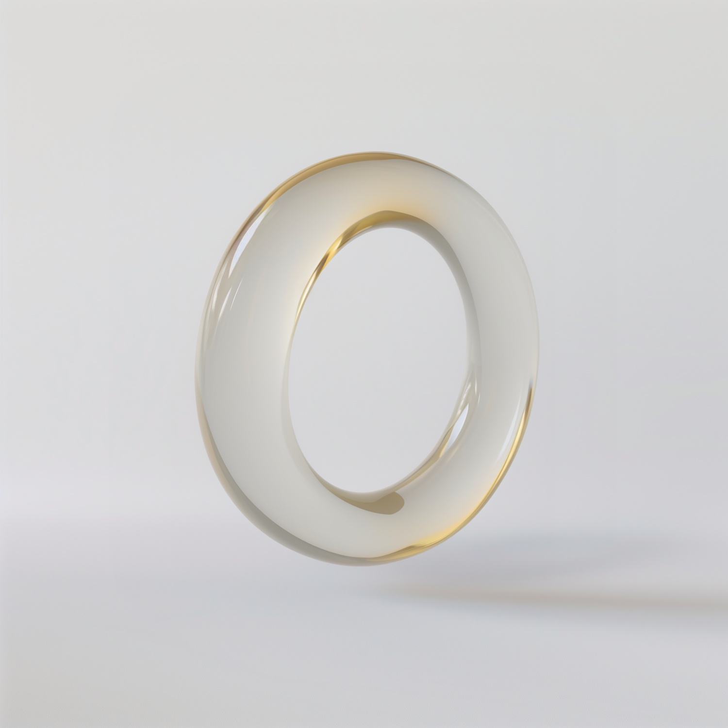 Elegant translucent torus with white and gold hues, floating against a soft background, showcasing minimalist design and modern aesthetics.