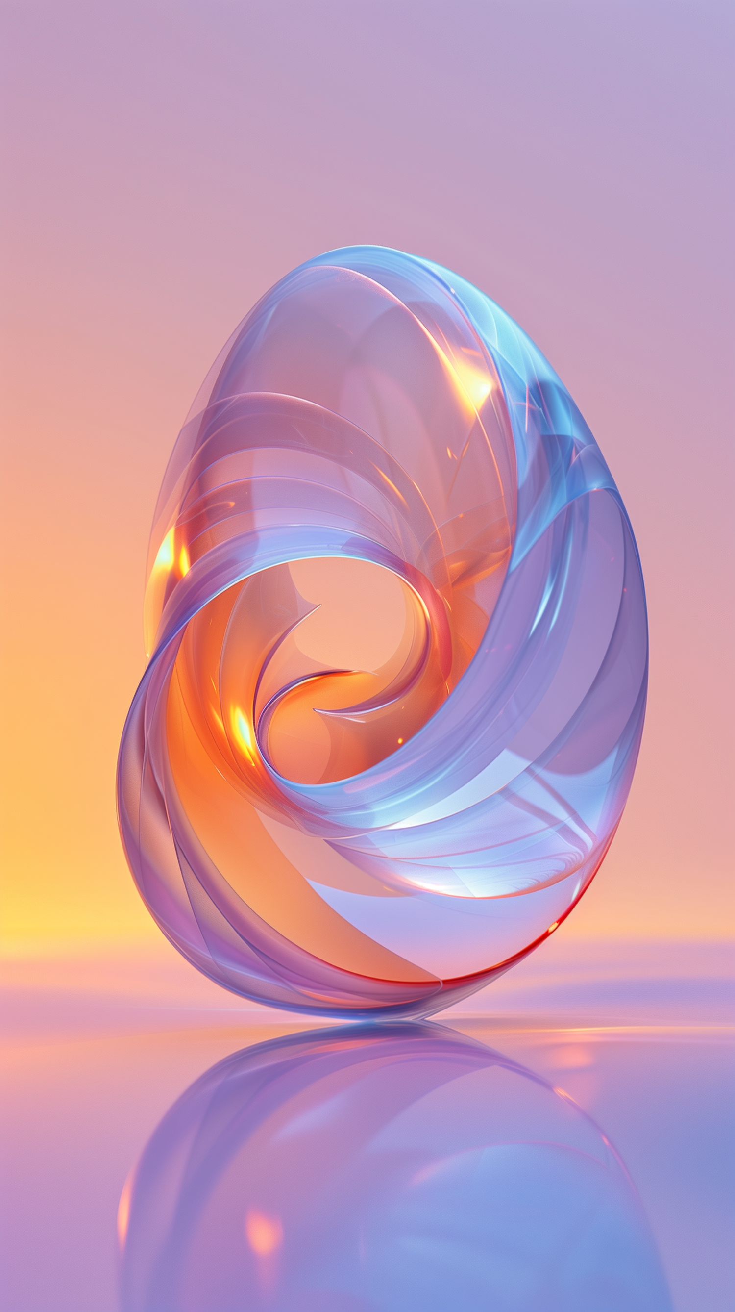 Vibrant 3D abstract shape with swirling translucent layers in orange, blue, and purple hues, set against a gradient background.