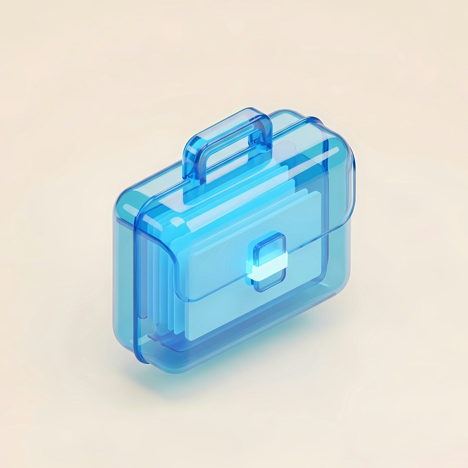 A sleek, translucent blue briefcase illustration on a soft beige background, showcasing a modern and minimalistic design.